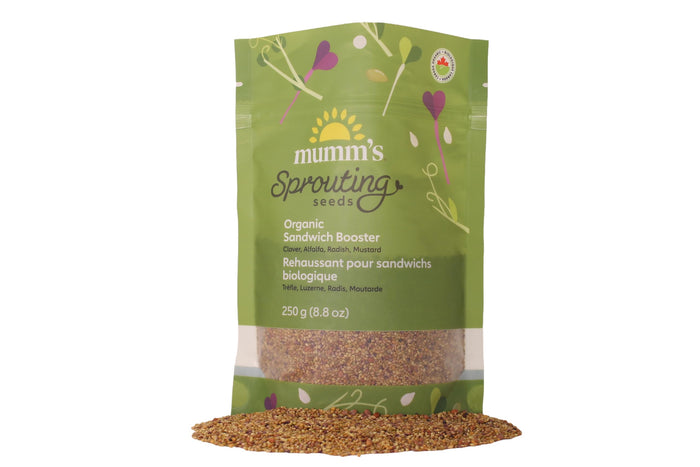 Sandwich Booster is a sprout mix of clover, alfalfa, radish, and mustard. It is an easy 5-day sprout that grows well in a jar or sprouting tray. Days to Sprout: 4 to 5 days Soak Time: 4-8 hours Yield: 1 tbsp of dry seed yields approx. 1.5-2 cups of sprouts. Storage: Our seeds should sprout well for a year after you purchase them, if stored in a cool dry place. If you’d like to extend the germination life of your seeds, store them in the fridge. If you store your seeds in the freezer, they’ll last even longer! Sprouting Directions Soak: Put 1-2 Tbsp. seed in a wide mouth jar with a sprouting lid. Add water, swirl, and drain. Refill jar with water and soak 4-12 hours. Drain well and invert jar at an angle on a sprouting or draining rack, or in a bowl or drain rack. Rinse: Twice a day, refill jar with cold water, swirl, and drain well. Enjoy! Ready to eat in 5 days. Refrigerate to store. (Sprouts store best when they are fairly dry.)