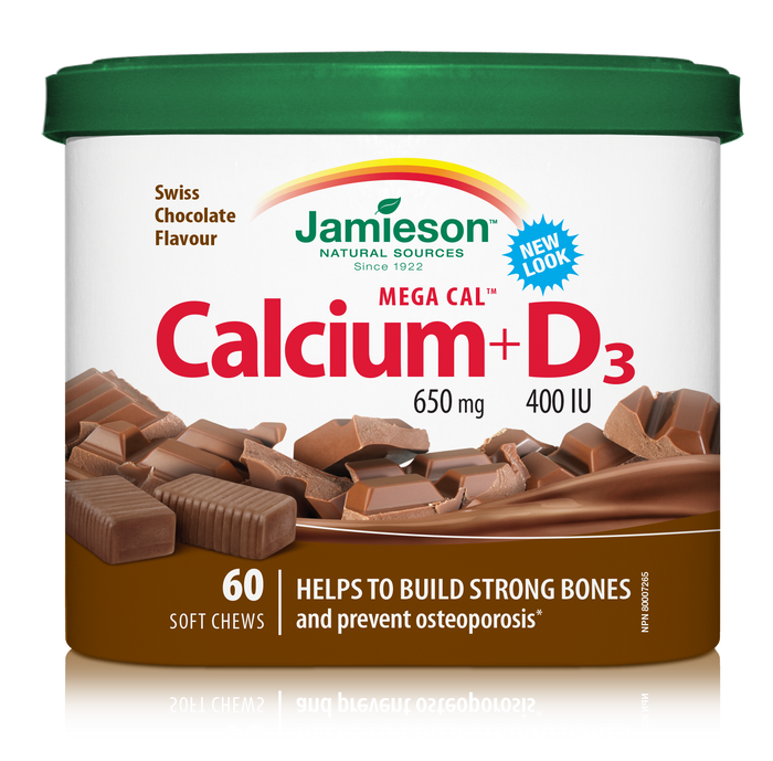 Description: Jamieson Mega Cal™ Calcium 600 mg + D3 400 IU Soft Chews is enhanced with vitamin D3 for optimal calcium absorption, this natural complex of five calcium sources provides a high-potency of calcium in a delicious swiss chocolate soft chew.