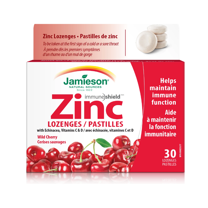 Description: Jamieson Wild Cherry Zinc Lozenges are formulated with highly bioavailable zinc citrate, Vitamin C, Vitamin D and Echinacea to enhance the immune system's virus-fighting power and help maintain optimal health. They dissolve quickly so the body can readily absorb the active ingredients, which provide quick relief from cold and flu symptoms.