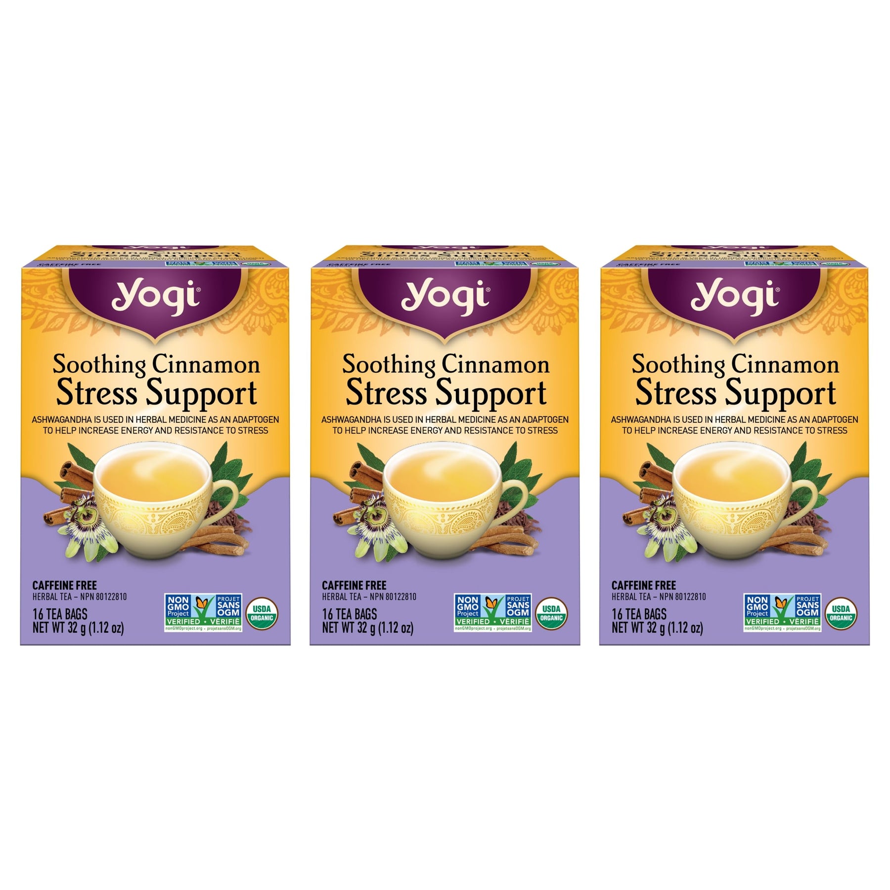 Yogi Tea - Soothing Cinnamon Stress Support Tea (3 Pack) - With Ashwagandha and Passionflower- Caffeine Free Organic Herbal Tea - 48 Tea Bags