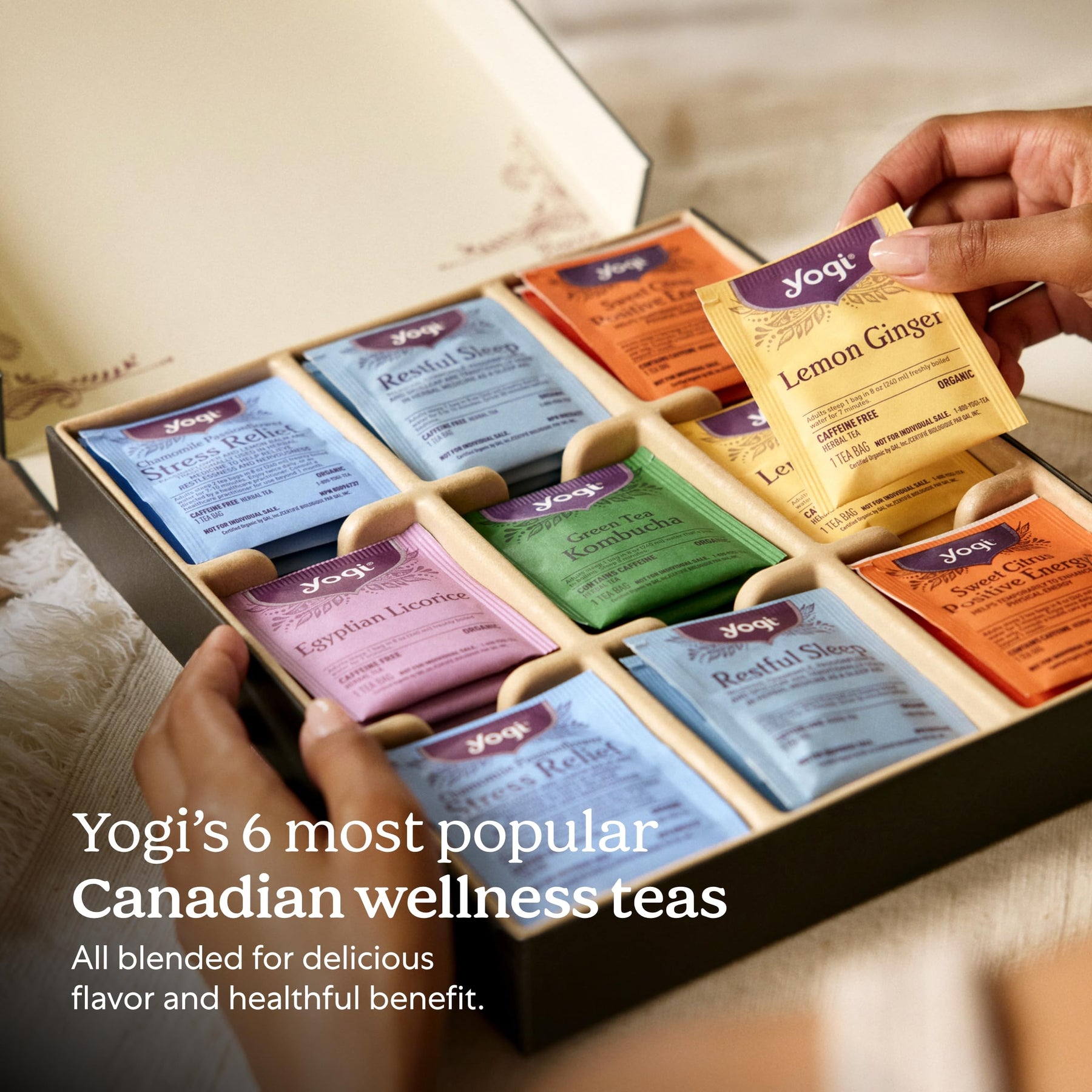 Yogi Canada Organic Tea Sampler Gift Box - Assorted Delicious Wellness Teas - 6 Favorite Herbal, Green & Black Teas - Tea Gift Set & Variety Pack (45 Tea Bags)