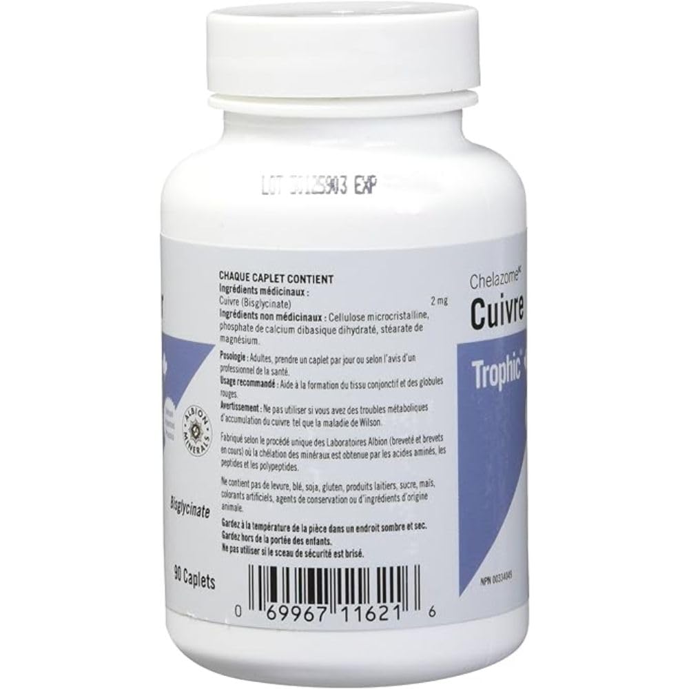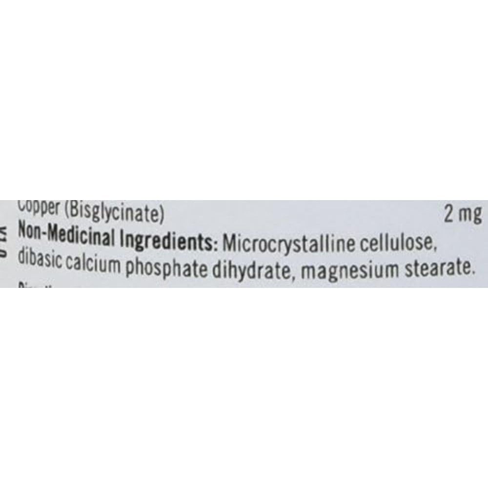 Copper (Bisglycinate) (Amino Acid Chelate)…….. 2 mg Non-Medicinal Ingredients: Microcrystalline cellulose, dibasic calcium phosphate dihydrate, magnesium stearate.