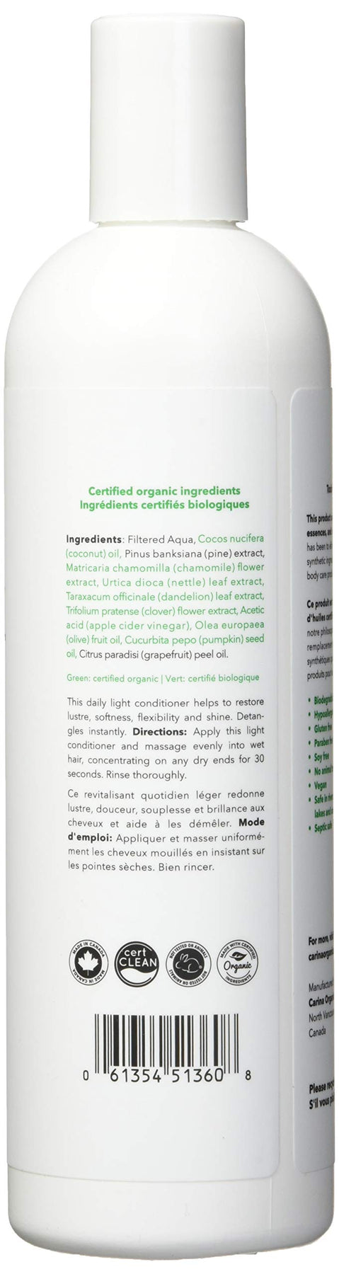 Filtered Aqua, Cocos nucifera (coconut) oil, Pinus banksiana (pine) extract, Matricaria chamomilla (chamomile) flower extract, Urtica dioca (nettle) leaf extract, Taraxacum officinale (dandelion) leaf extract, Trifolium pratense (clover) flower extract Acetic Acid (Apple Cider Vinegar)cid, Olea europaea (olive) fruit oil, Cucurbita pepo (pumpkin) seed oil, Citrus paradis (grapefruit) peel oil.