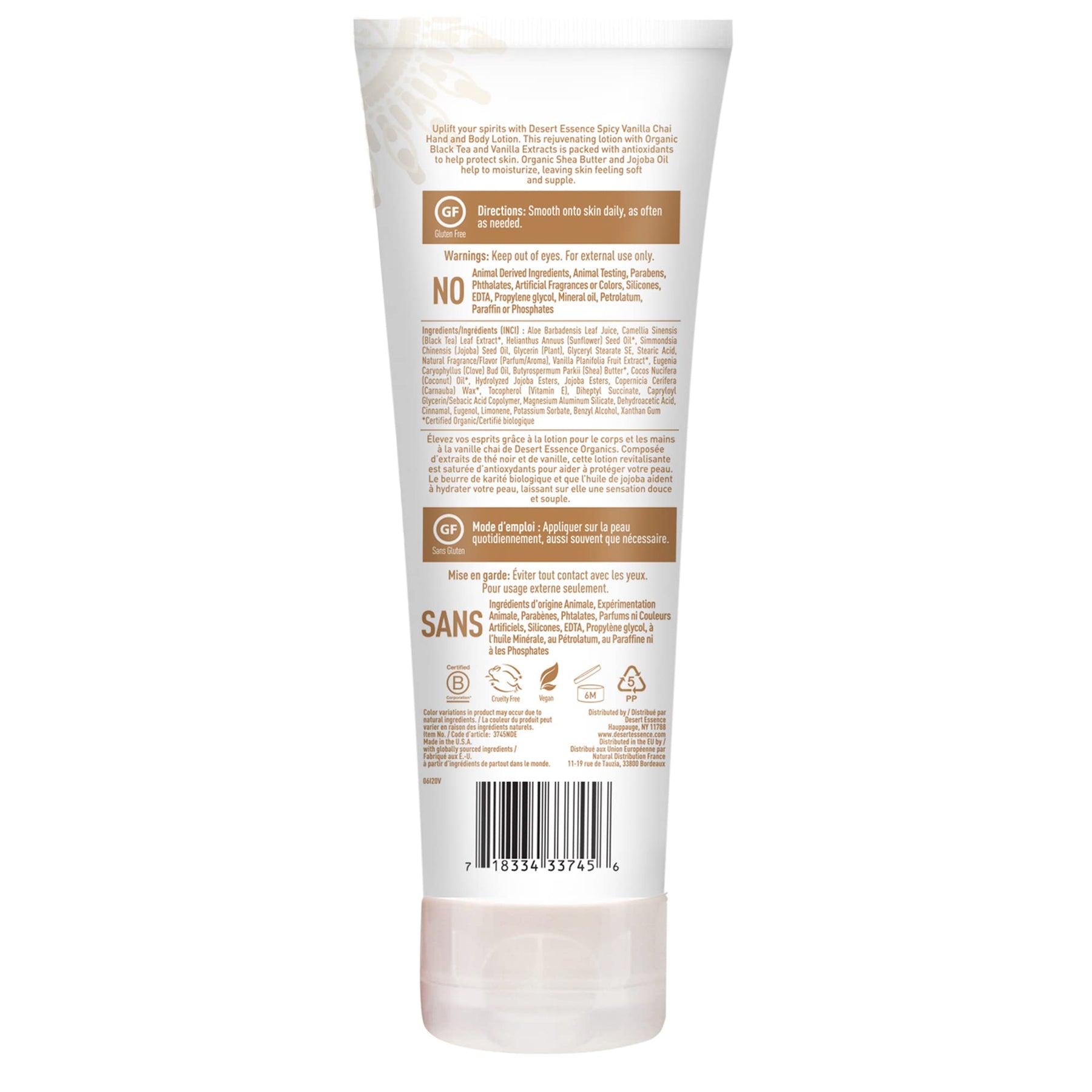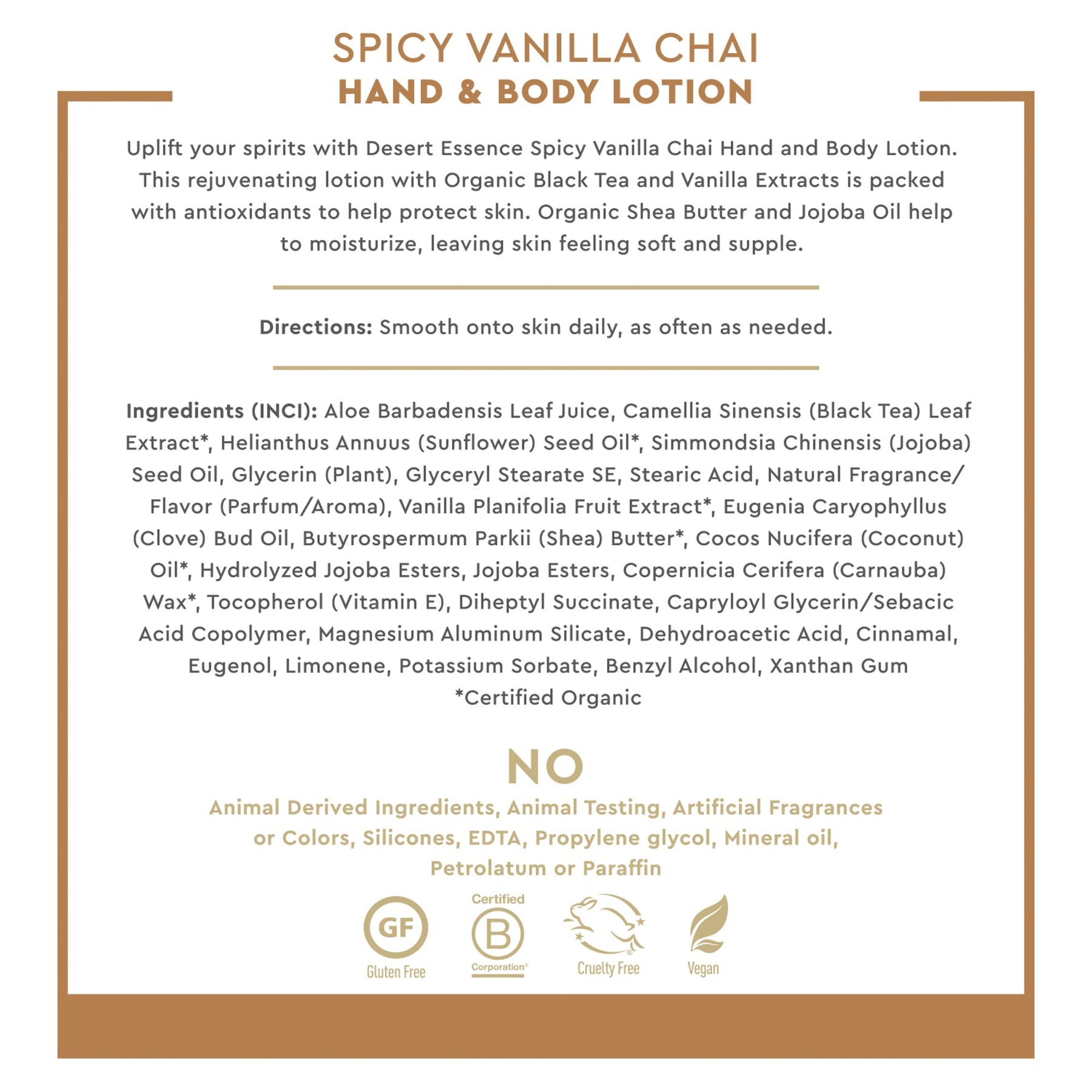 - Certified organic - desert essence spicy vanilla chai hand and body lotion uses natural ingredients and is certified to nsf organic standard