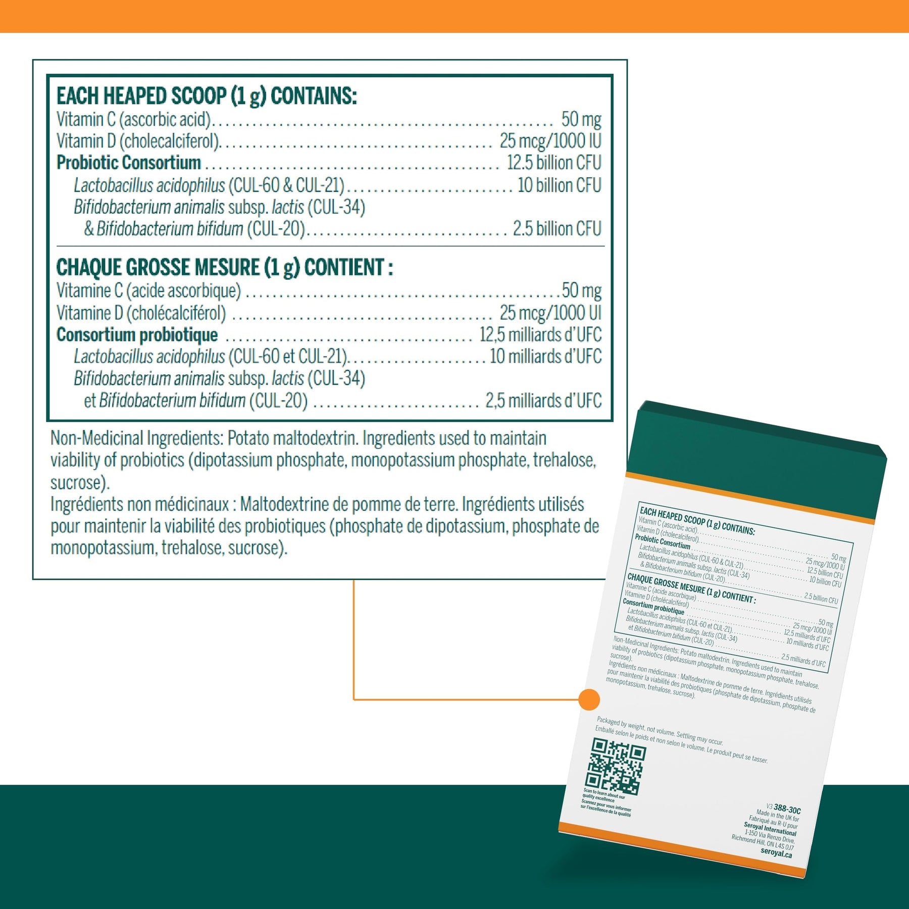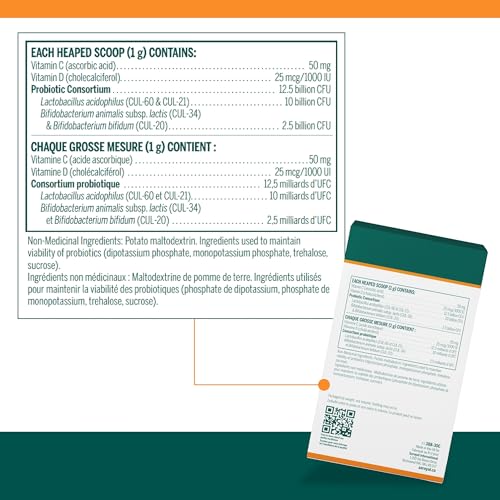 Recommended Dose: Adolescents and Children (1 year and older): In a glass, add 1 heaped scoop to water or juice and dissolve completely before administration to children. Take once daily, at least 2 to 3 hours before or after taking antibiotics, or as recommended by your healthcare practitioner. Immune Support: Take for a minimum of 4 weeks to see beneficial effects. Risk Information: Do not use if you have an immune-compromised condition. Consult your healthcare practitioner prior to use if you have nausea, fever, vomiting, bloody diarrhoea or severe abdominal pain. Stop use and consult your healthcare practitioner if symptoms of digestive upset occur, worsen or persist beyond 3 days. Consult your healthcare practitioner if symptoms persist or worsen. Keep out of the reach of children. This product was sealed for your protection. Do not use if box or contents are open or damaged. Store under refrigeration (below 8 °C).