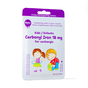 Fulfill your child's daily iron needs with the Nutrameltz Carbonyl Iron. These oral supplements are blueberry flavoured and contain 18 mg of carbonyl iron per tablet to give you the boost they need for optimum health. The supplement delivers a potent form of iron that is highly bioavailable for easy absorption while being gentle on the stomach.