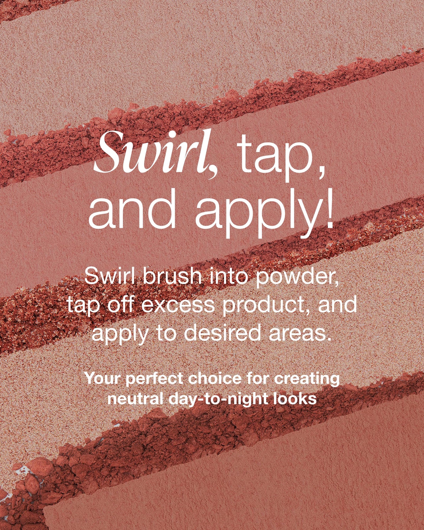 Swirl brush into powder, tap off excess product, and apply to desired areas.