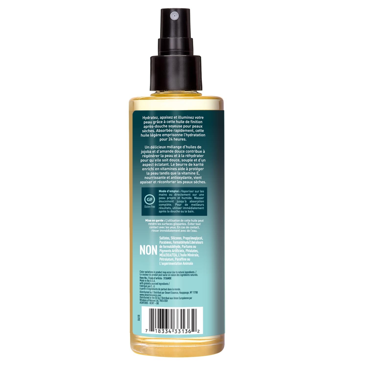 - Deeply moisturizing after-shower finishing body oil spray formulated with Jojoba Oil, Almond Oil and SheaButter.