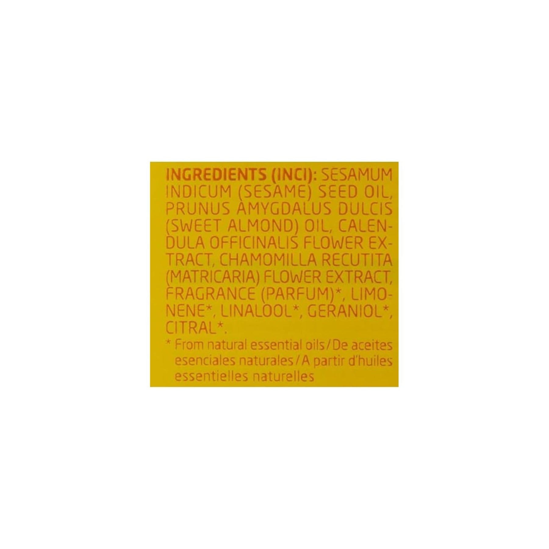Ingredients: Sesamum indicum (sesame) seed oil, prunus amygdalus dulcis (sweet almond) oil, calendula officinalis flower extract, chamomilla recutita (matricaria) flower extract, fragrance (parfum)*, limonene*, linalool*, geraniol*, citral* *From natural essential oils.