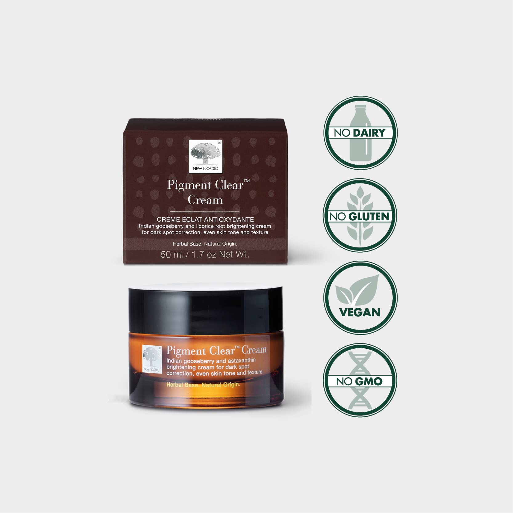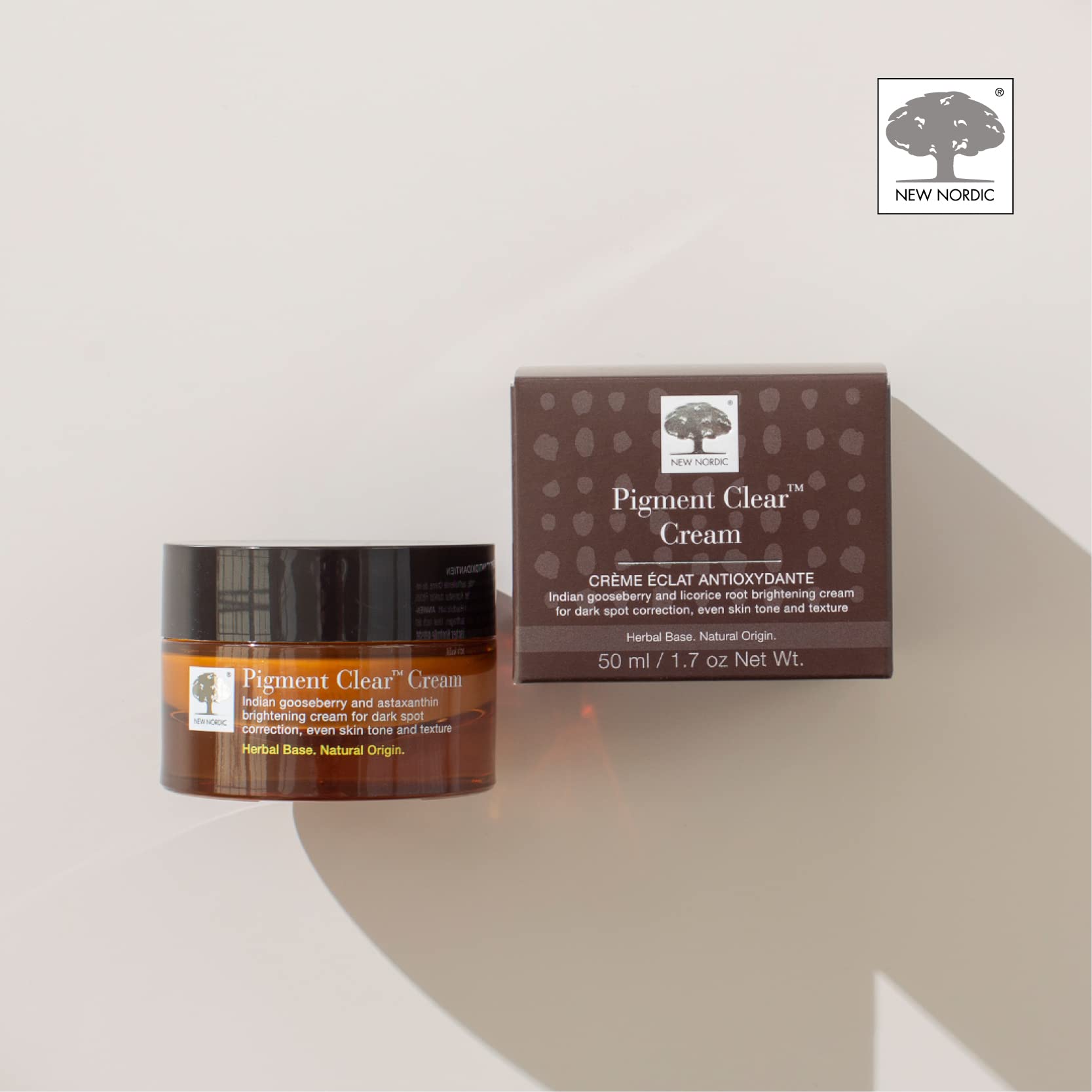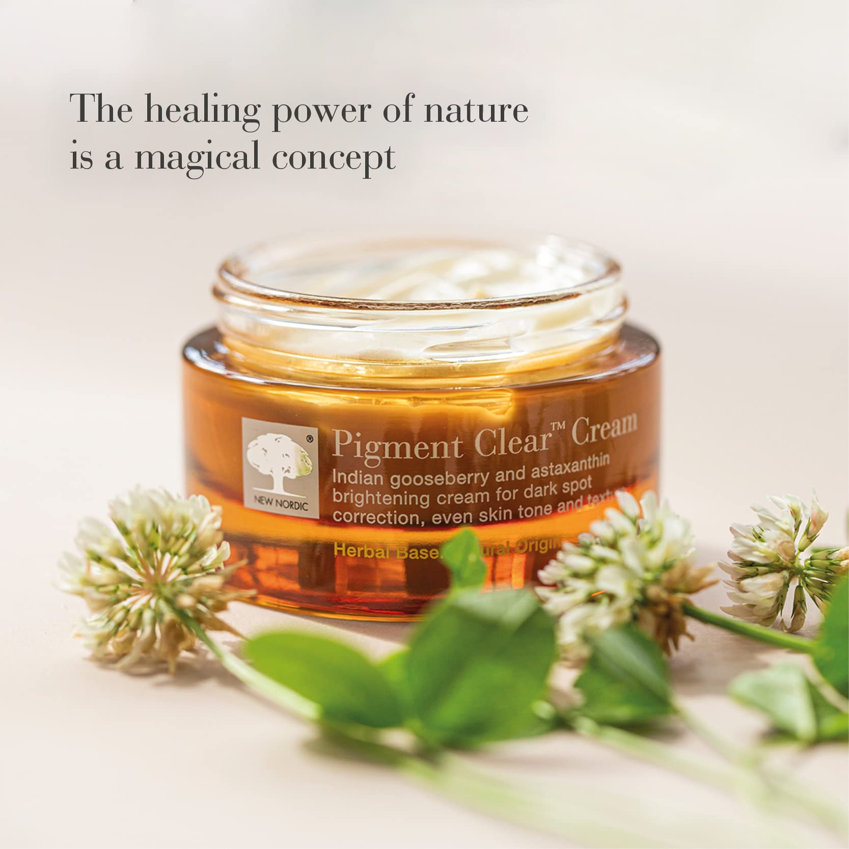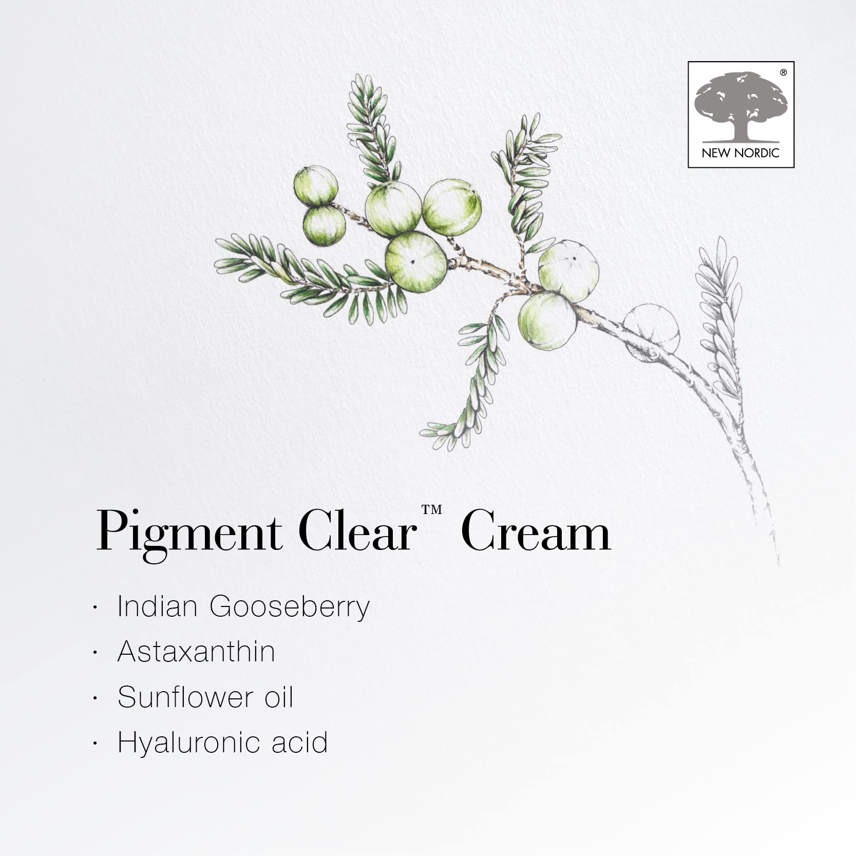Pigment Clear Cream is an antioxidant-rich, brightening day cream featuring fine molecular hyaluronic acid, moisturizing sunflower oil, and potent plant extracts like clover, liquorice root, Indian gooseberry, mulberry, and astaxanthin. Clover extract refines skin texture, liquorice root evens tone and fades dark spots, Indian gooseberry's vitamin C-rich extract promotes radiance, mulberry brightens skin, and astaxanthin enhances youthful appearance.