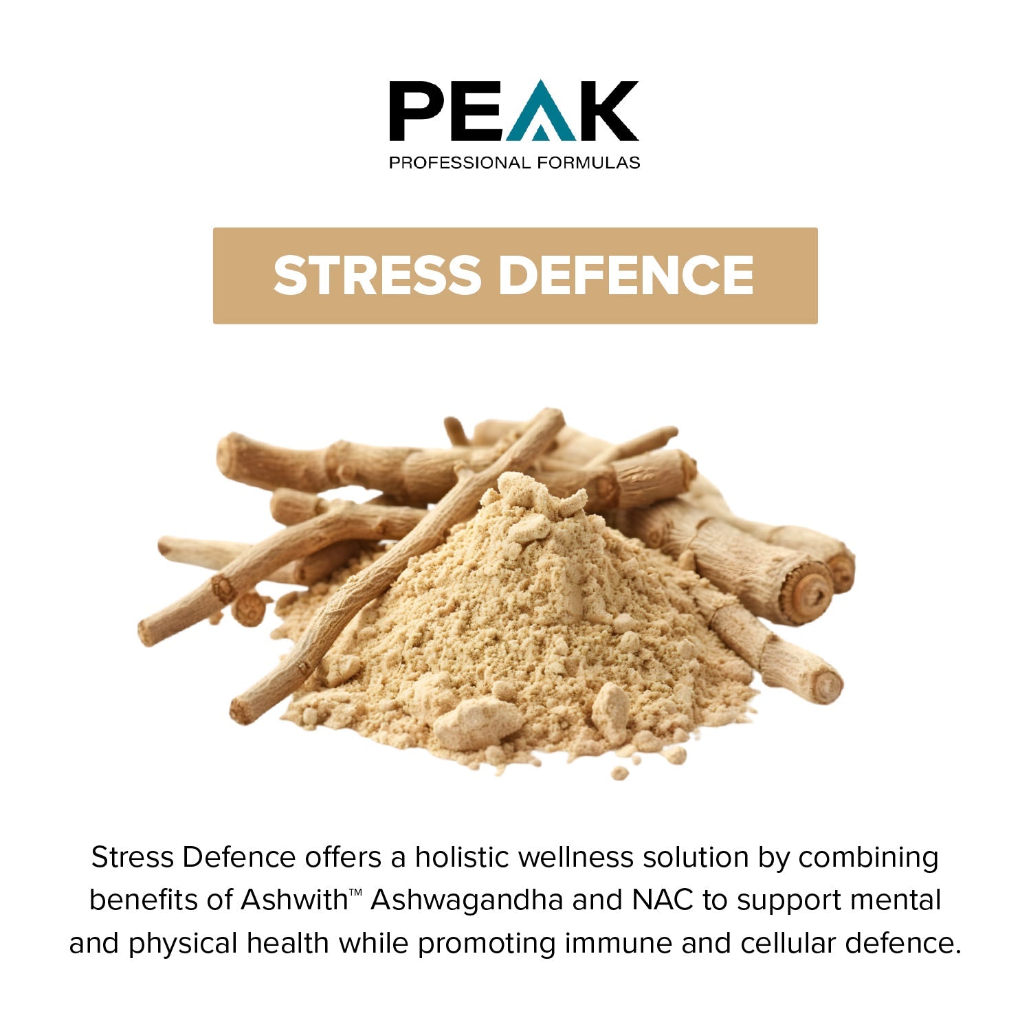 PEAK Stress Defence™ is a next-generation stress support formula designed for real-world demands. Combining Ashwith™—a pharmaceutical-grade, 30:1 ashwagandha extract standardized to 12% withanolides—with NAC (N-Acetyl Cysteine), this clinically grounded supplement supports energy, clarity, and cellular resilience. Ashwith™ targets three specific compounds that activate Nrf2, helping to protect against oxidative stress while balancing cortisol levels.