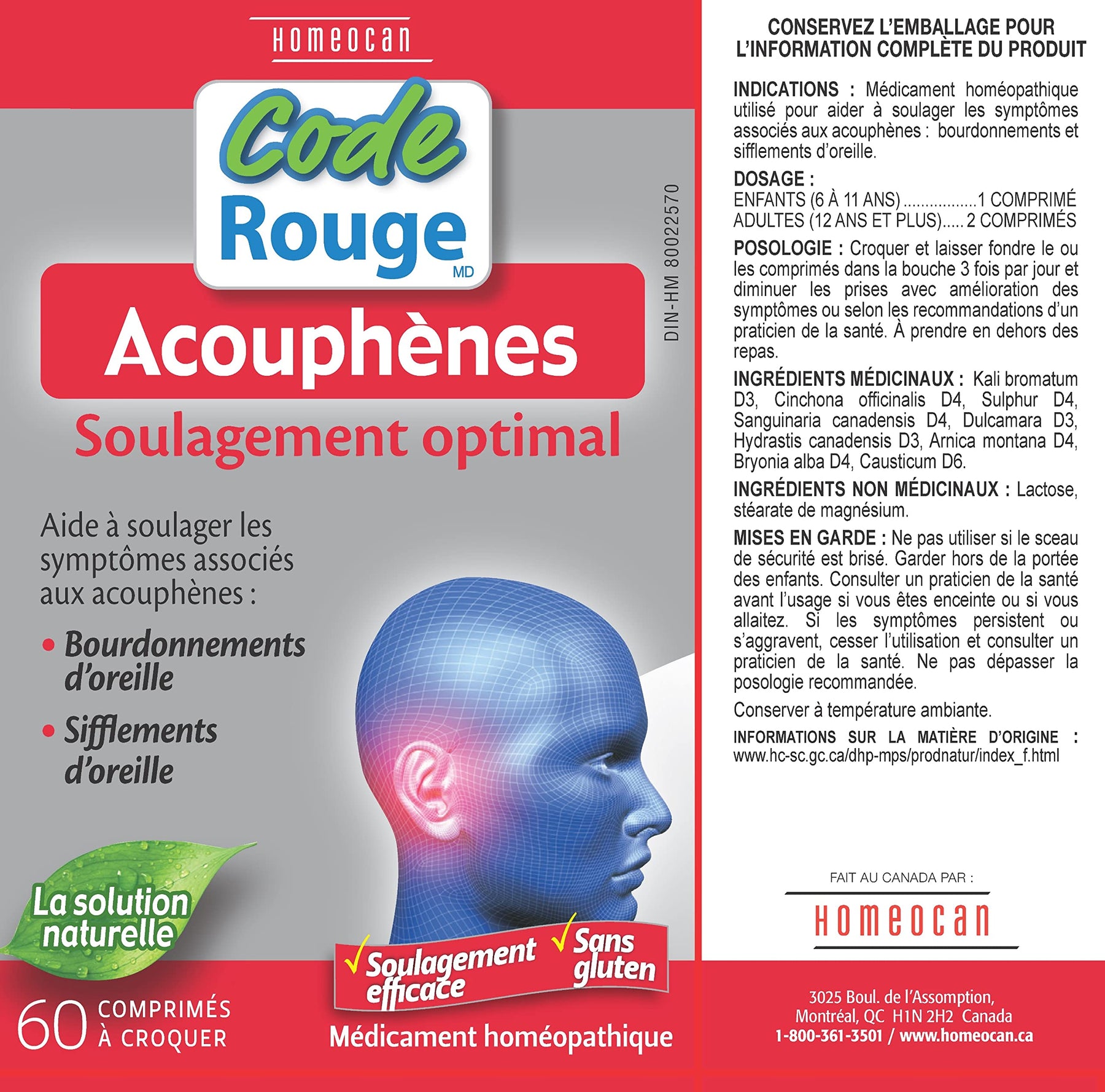 Medicinal ingredients: Kali bromatum 3X, Cinchona officinalis 4X, Sulphur 4X, Sanguinaria canadensis 4X, Dulcamara 3X, Hydrastis canadensis 3X, Arnica montana 4X, Bryonia alba 4X, Causticum 6X. Non medicinal ingredients: Lactose, magnesium stearate.