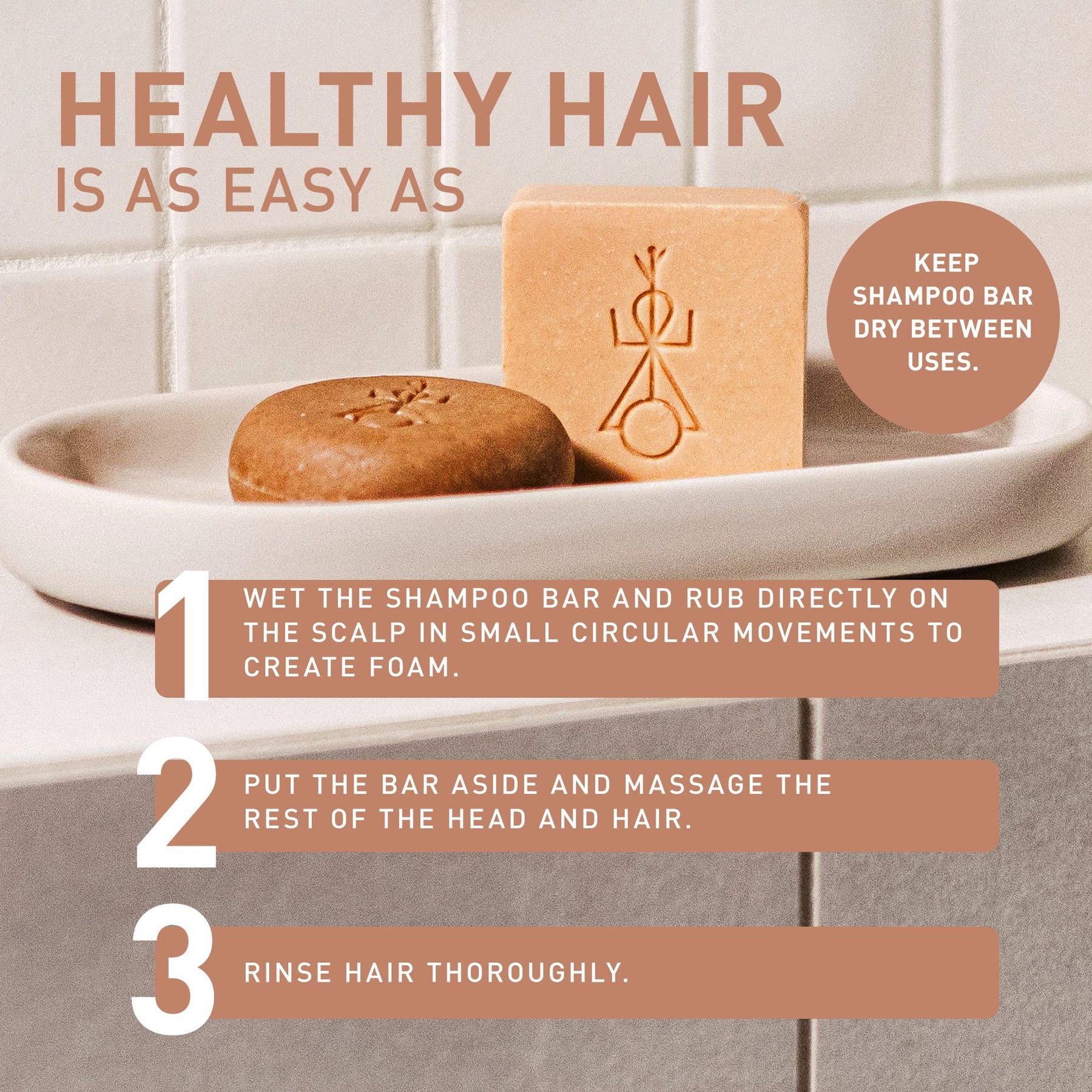 - Wet the shampoo bar and rub directly onto hair or between hands to create a lather.