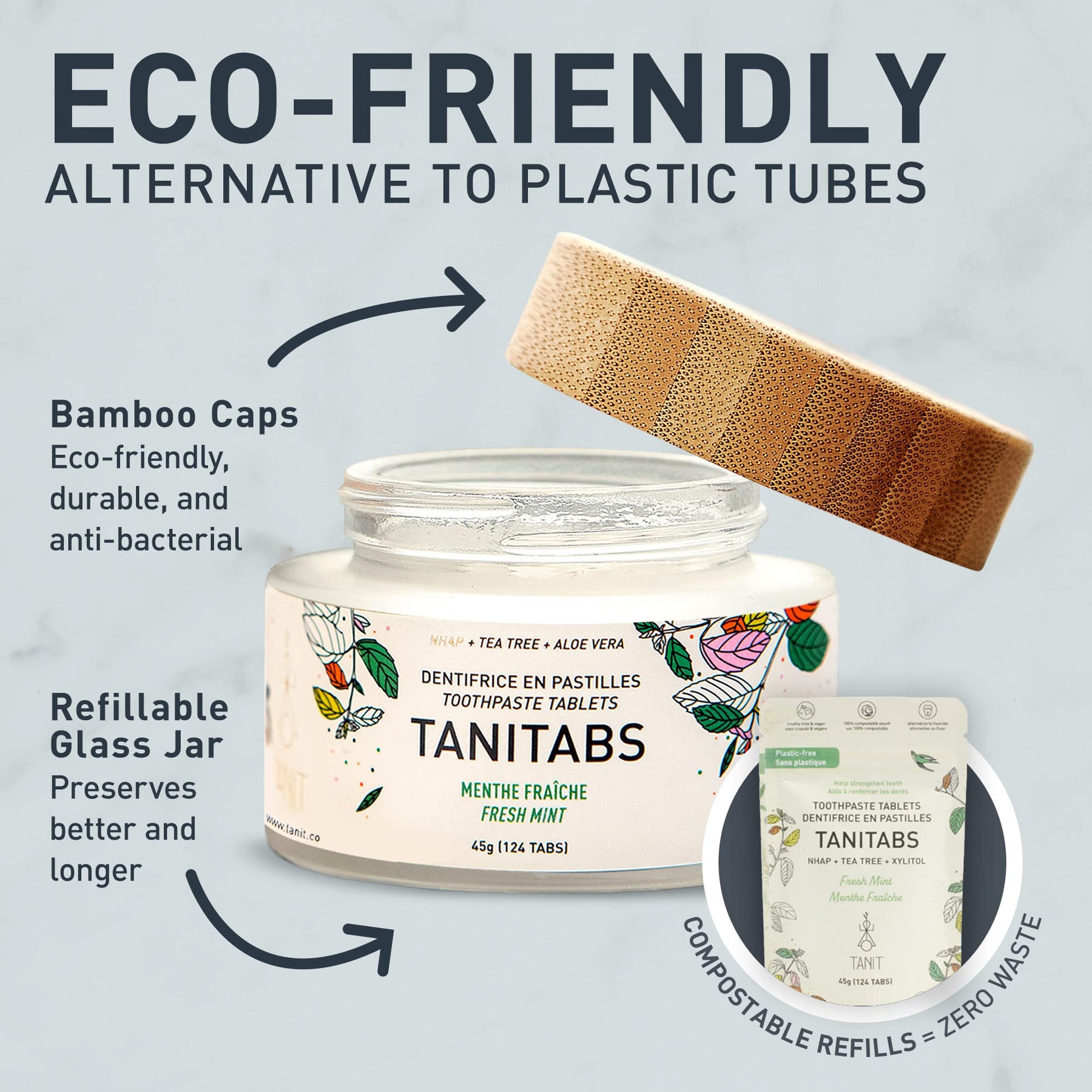 TANIT TANITABS Fresh Mint Toothpaste Tablets - Fluoride-Free, Natural Toothpaste for Gum and Teeth Care, Zero-Waste, Eco-friendly, Perfect for Travel, Comes in Bamboo Jar - 124 Tabs