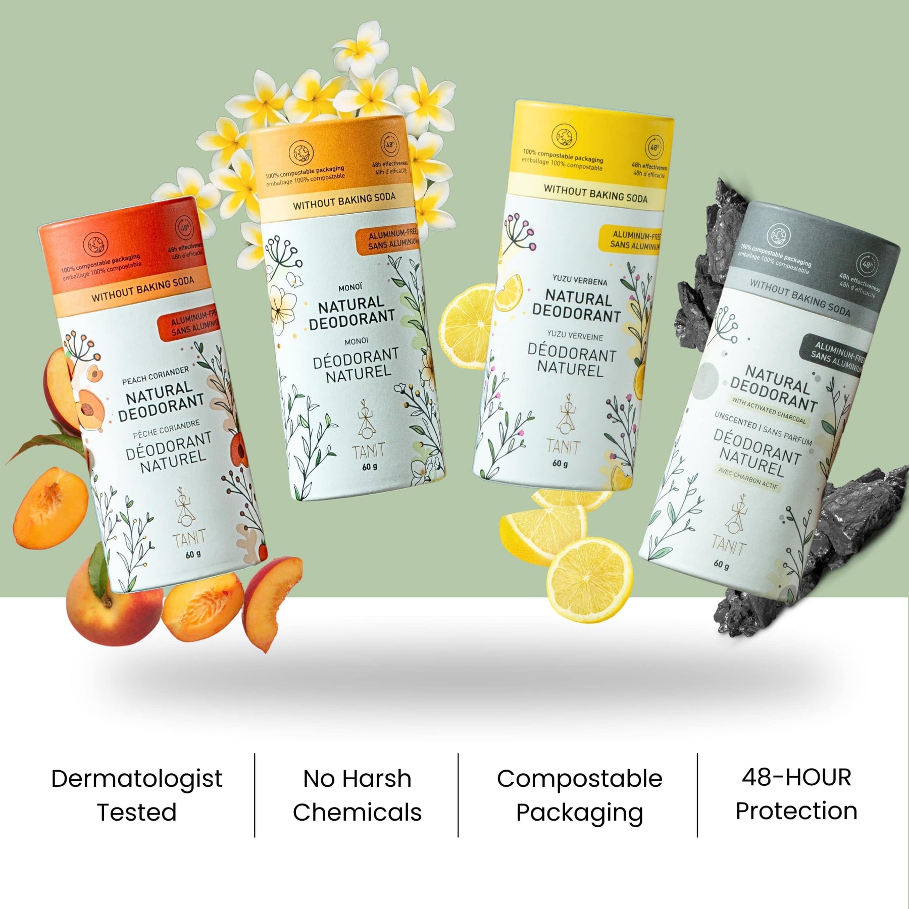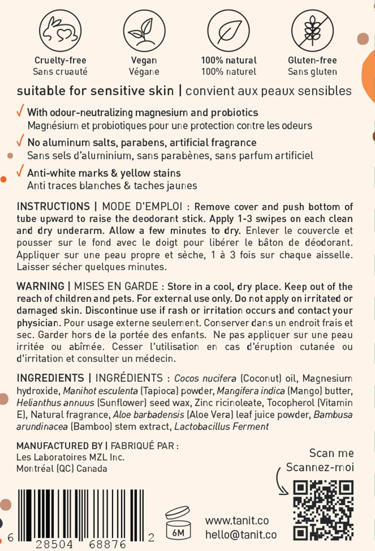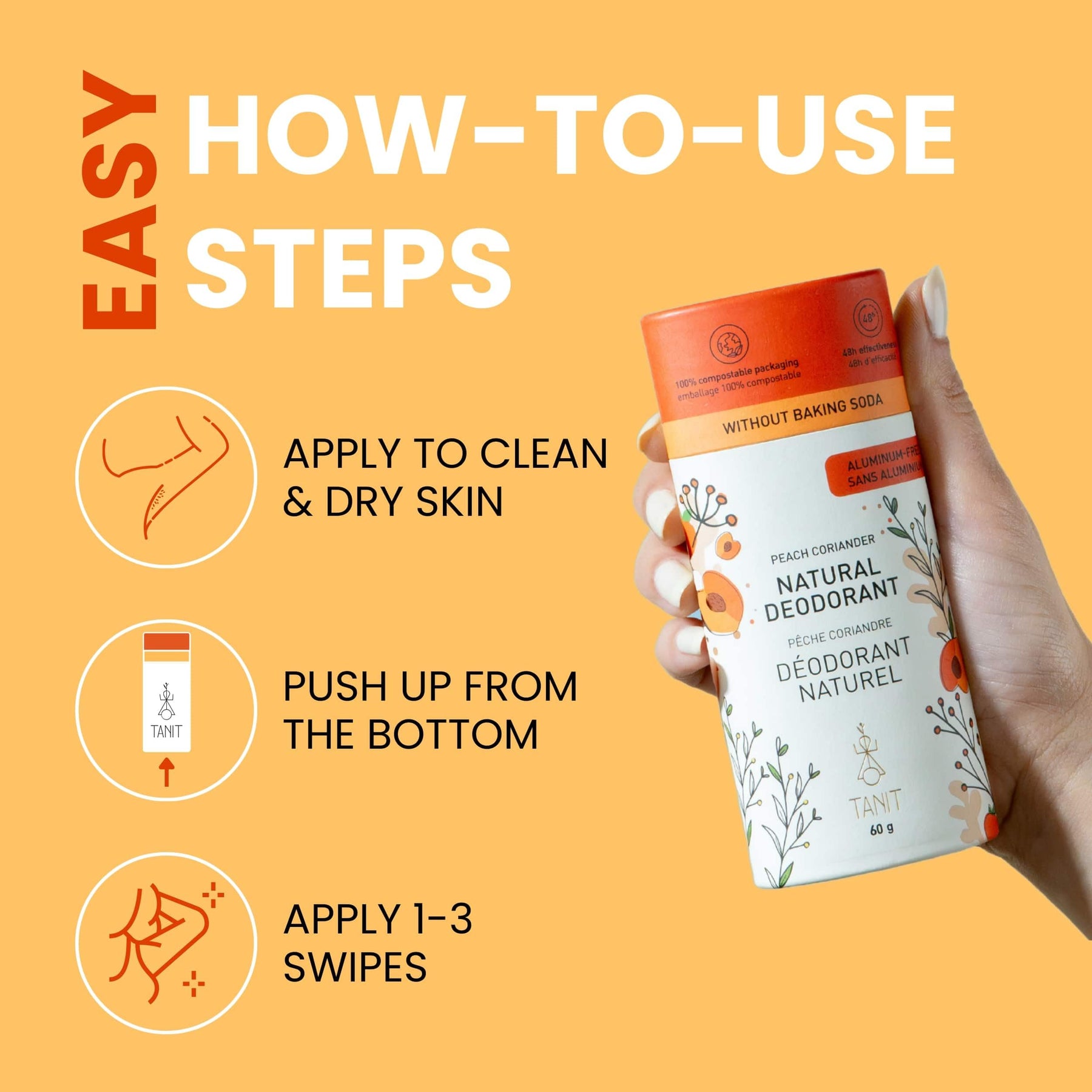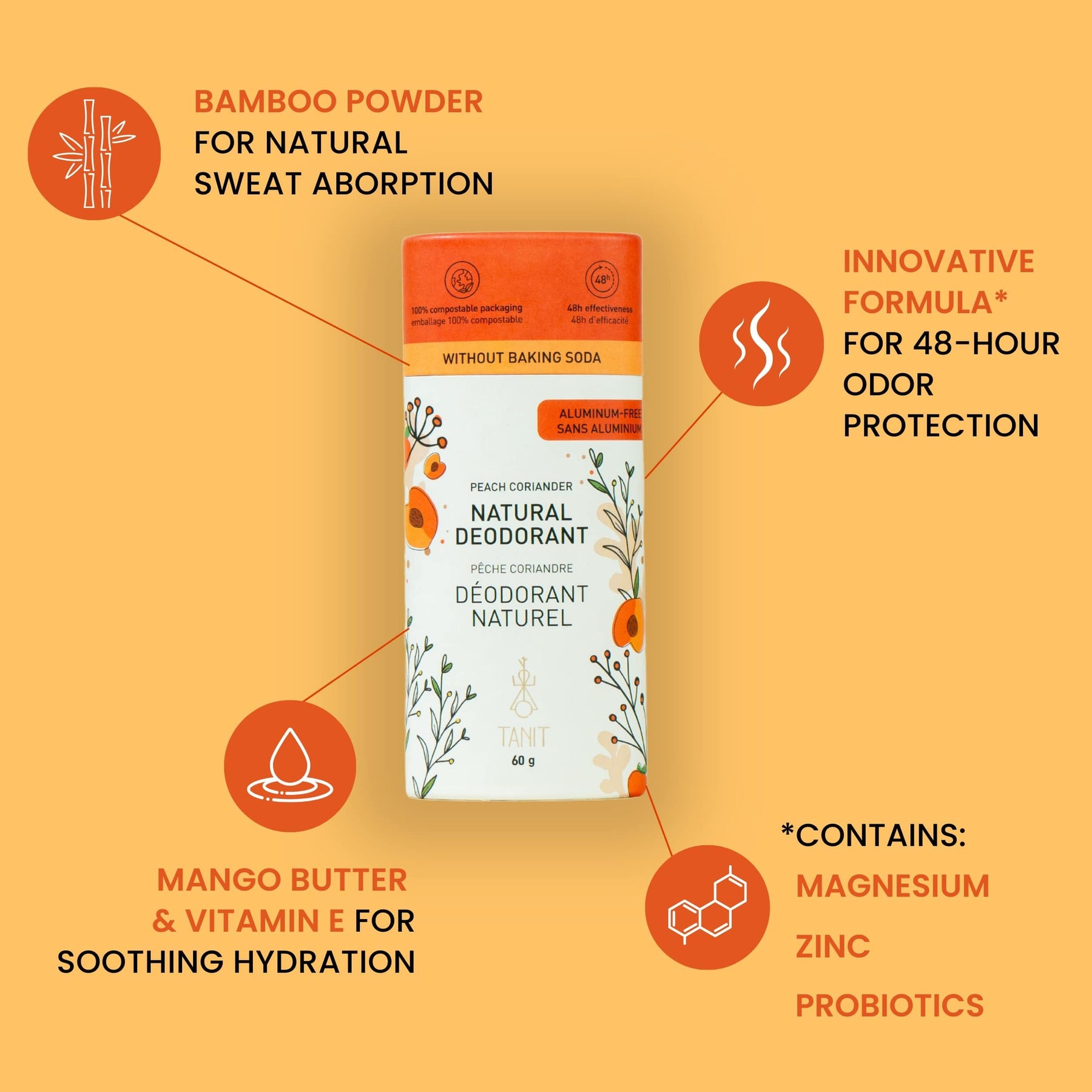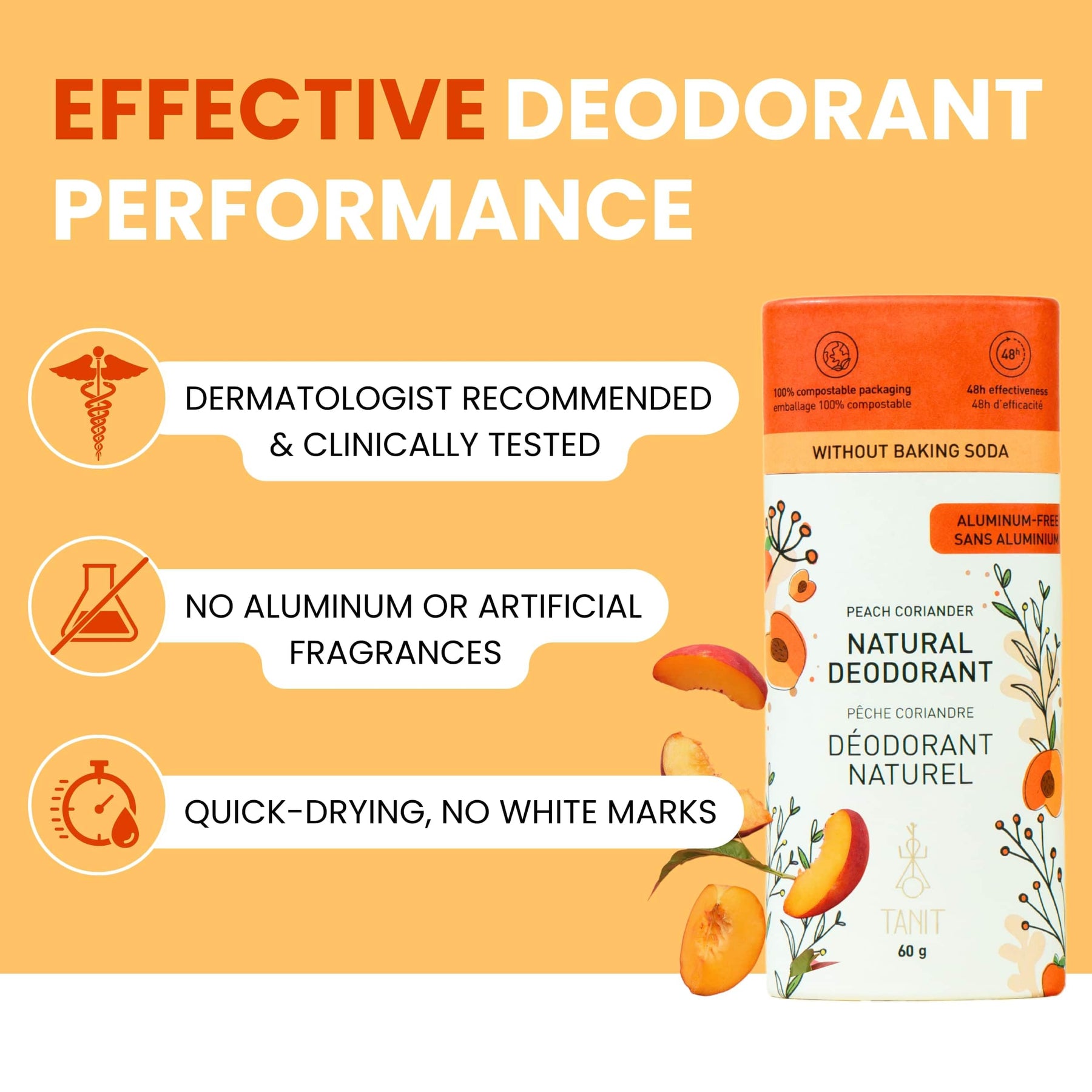 TANIT Natural Solid Deodorant Stick, Peach Coriander 60g, Long-Lasting Odour Protection, Vegan, Plastic-Free, Aluminum-Free, Smooth Application, No White Mark, Ideal for Sensitive Skin, Made in Canada