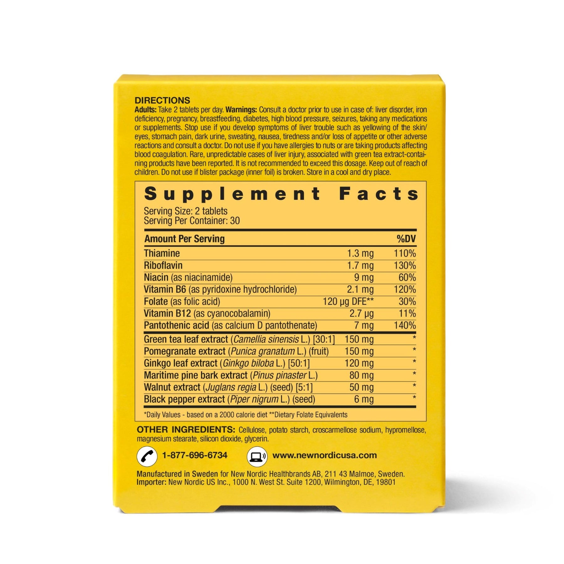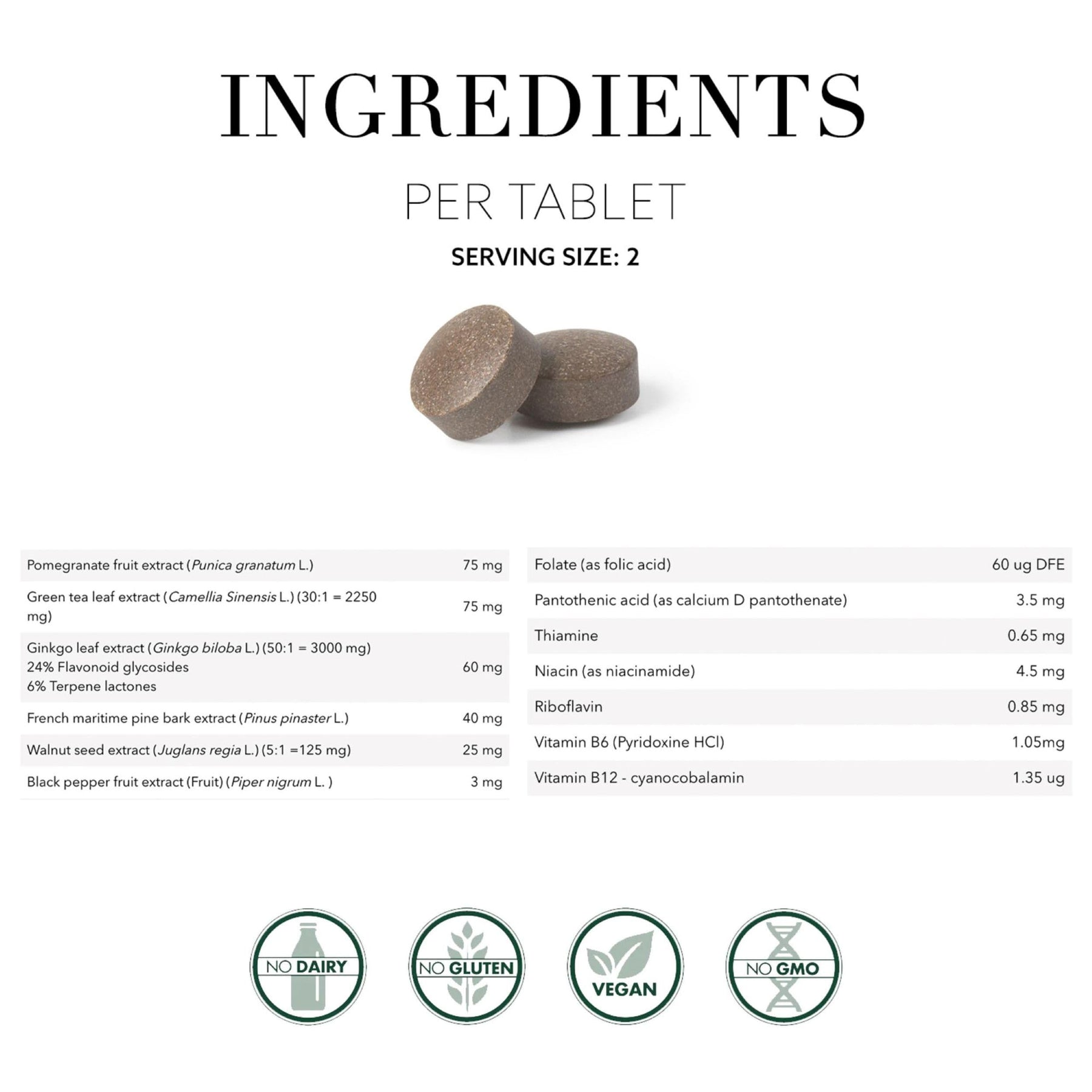 Pomegranate fruit , Green tea leaf extract , Ginkgo leaf extract, Flavonoid g,Terpene lactones, French maritime pine bark extract, Walnut seed extract , Black pepper fruit extrac, Vitamin B1 - thiamine , Vitamin B2 - riboflavin , Vitamin B3 - niacinamide , Vitamin B5 - pantothenic acid , Vitamin B6 - pyridoxine - 1.06 mg, Vitamin B9 - folate, Vitamin B12 - cyanocobalamin , NON-INGREDIENTS: Cellulose, potato starch, croscarmellose sodium, hypromellose, silica, magnesium stearate, glycerin.