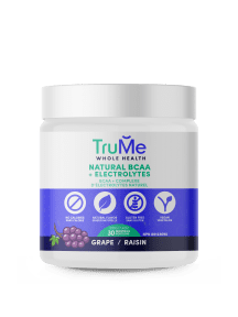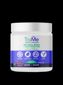 TruMe Whole Health Branched-Chain Amino Acids plus electrolytes - Grape Flavor. Each canister of 210g of powder contains 30 scoop servings.