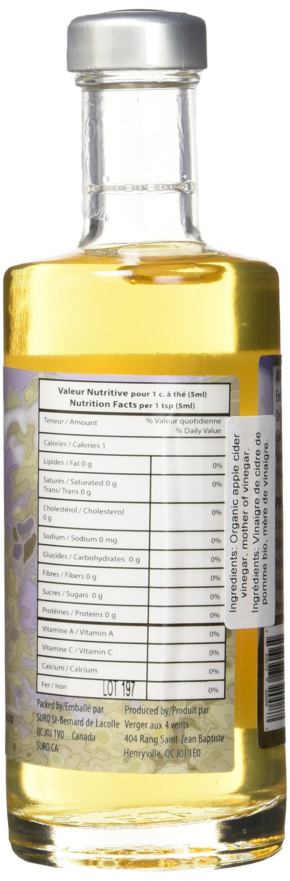 This organic apple cider vinegar is unique. It is still made artisanally like it used to be made a hundred years ago. It takes one full year to produce. The apple cider is transformed into apple cider vinegar uniquely by the action of the mother of vinegar. It is made without the use of modern techniques that speed up the process. This insures that you get all the benefits a high quality apple cider vinegar can bring. It is certified organic and non-pasteurized.