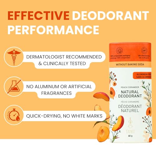 TANIT Natural Solid Deodorant Stick, Peach Coriander 60g, Long-Lasting Odour Protection, Vegan, Plastic-Free, Aluminum-Free, Smooth Application, No White Mark, Ideal for Sensitive Skin, Made in Canada