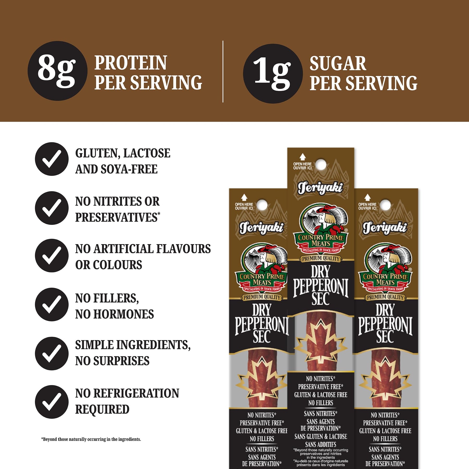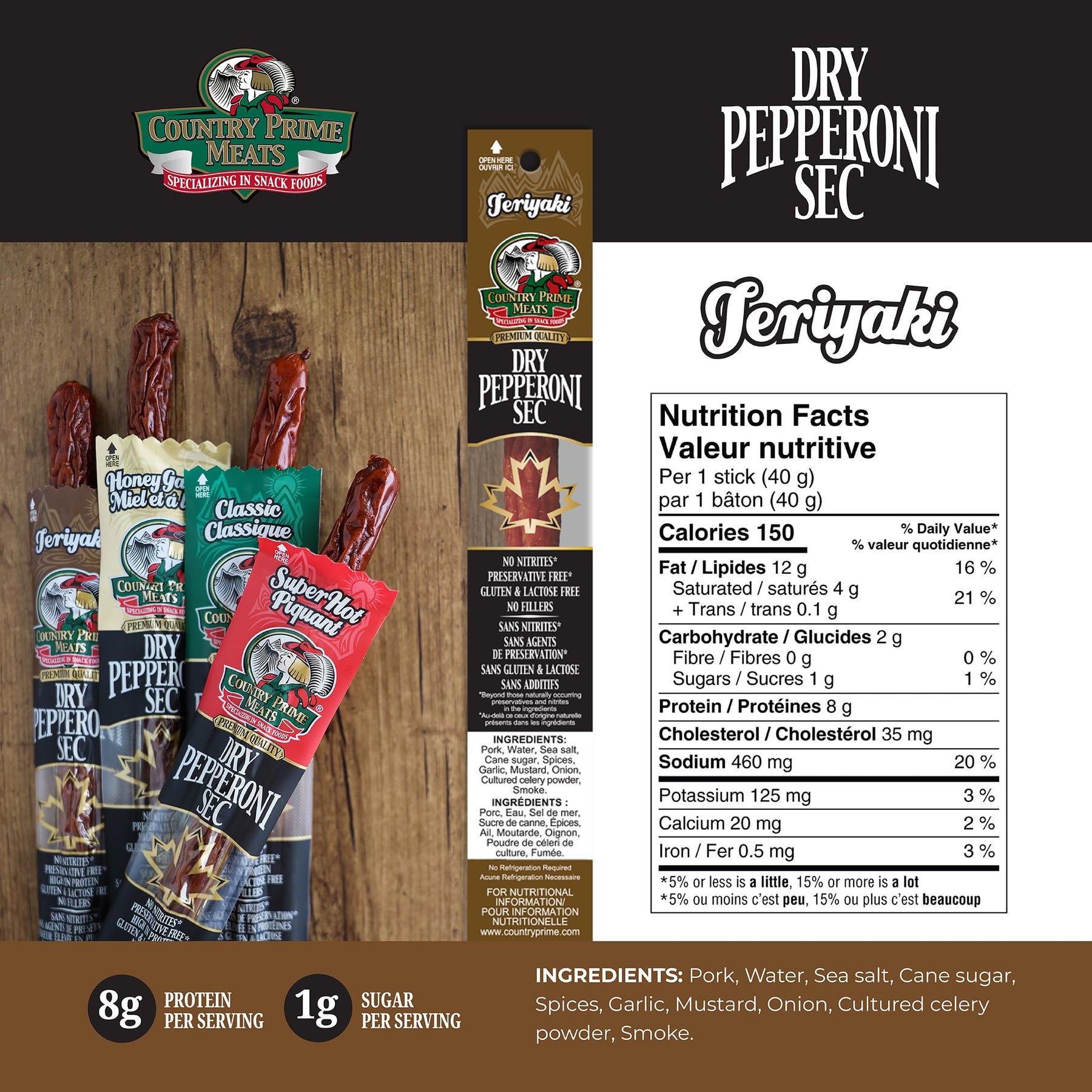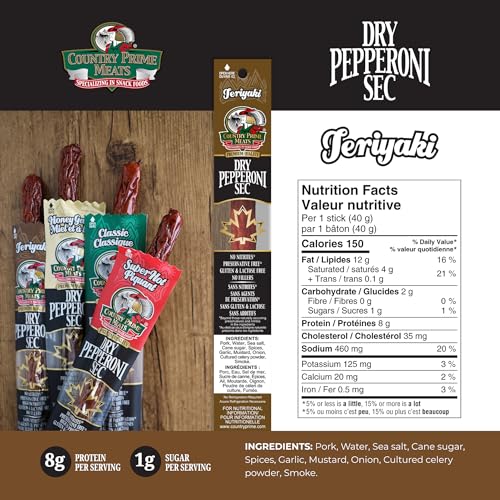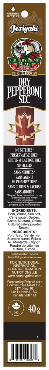 Each Display Box contains eight 125 G packages. Dry Pepperoni - Teriyaki, Cooked, Naturally Smoked Sausages