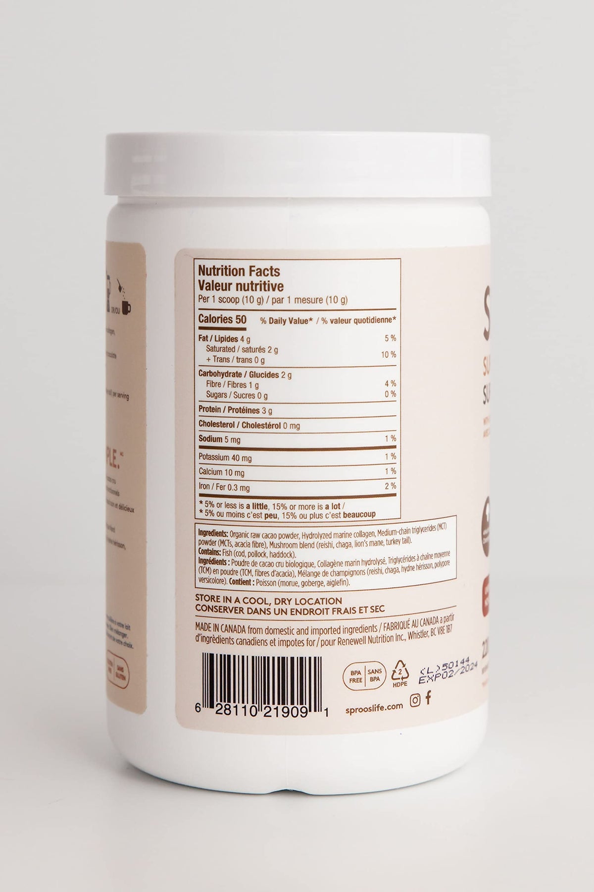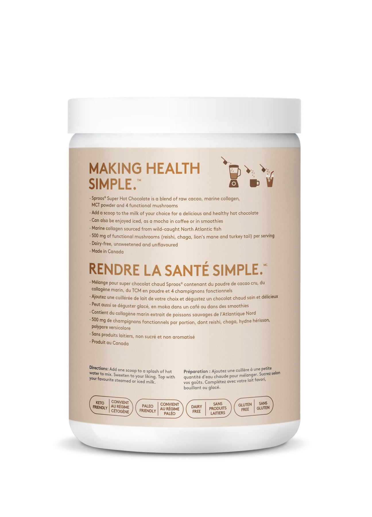 SPROOS Super Hot Chocolate | Organic Raw Cacao Powder, Premium Wild-Caught Marine Collagen, MCT Powder & A Blend of Four Mushrooms | Unsweetened, 220 g Tub (22 Servings)