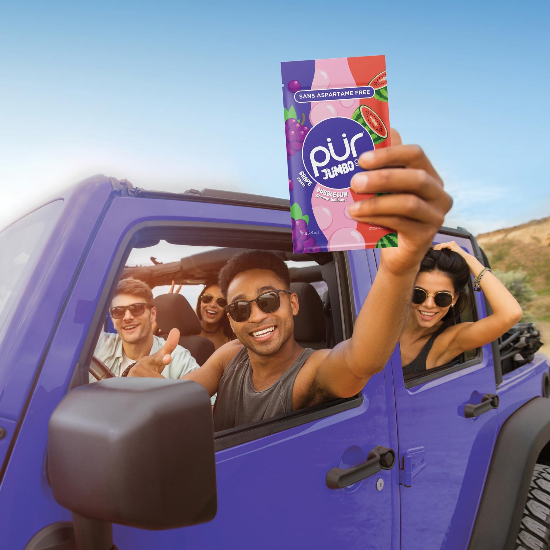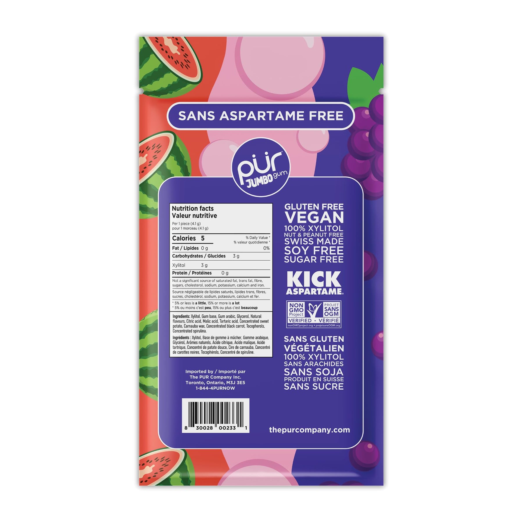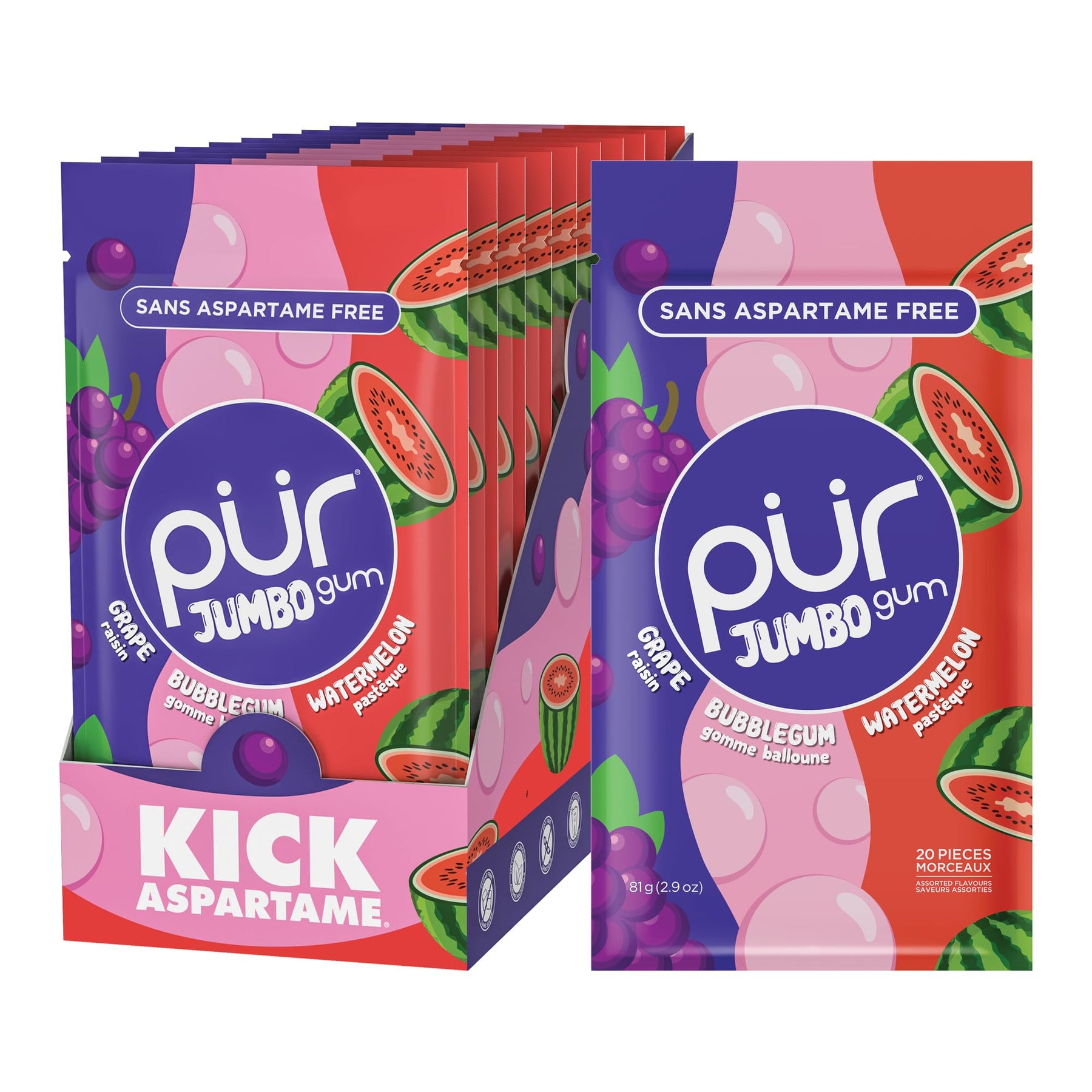 PUR Jumbo Gum | Aspartame Free Chewing Gum | 100% Xylitol | Natural Bubblegum, Grape, Watermelon Flavour, 20 Pieces (Pack of 10)