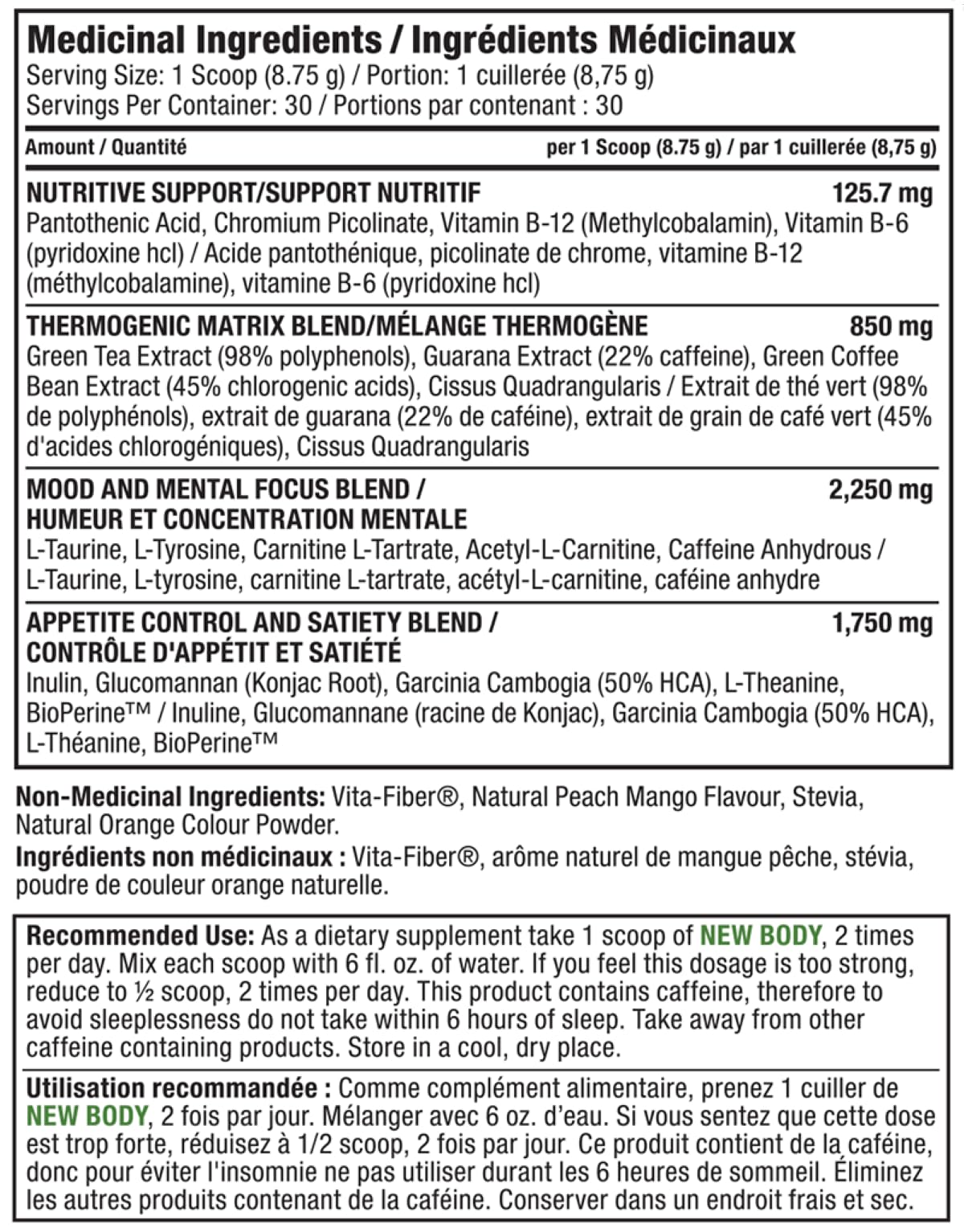 Suggested Use: Mix 1 scoop (8.75 grams) of New Body - Natural Peach Mango with water or your favorite beverage. Consume daily as part of your weight management program.