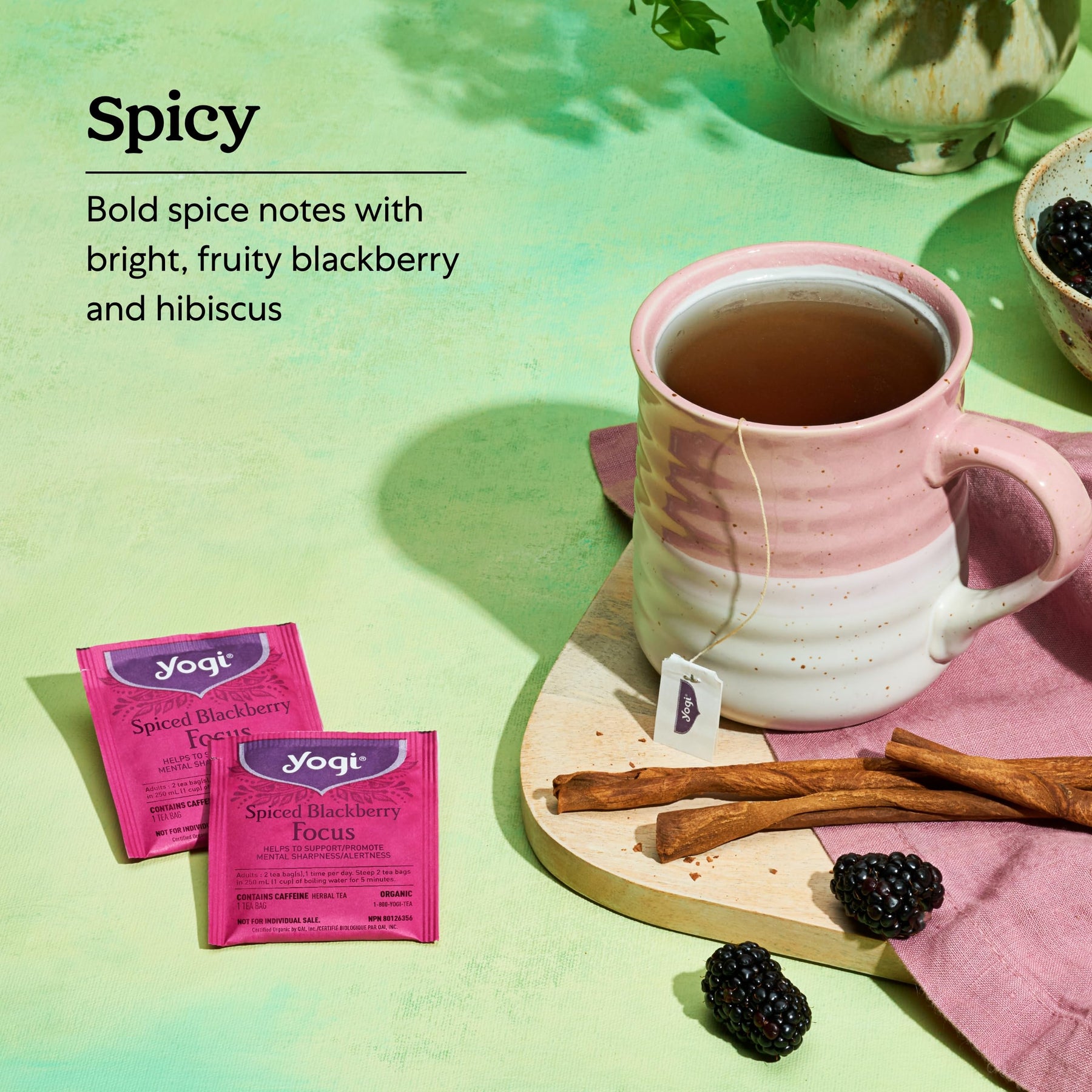 - Bright & Fruity Tea: Yogi Spiced Blackberry Focus tea combines warming Clove and Cinnamon with Blackberry and Hibiscus Flower to add bright, fruity flavor