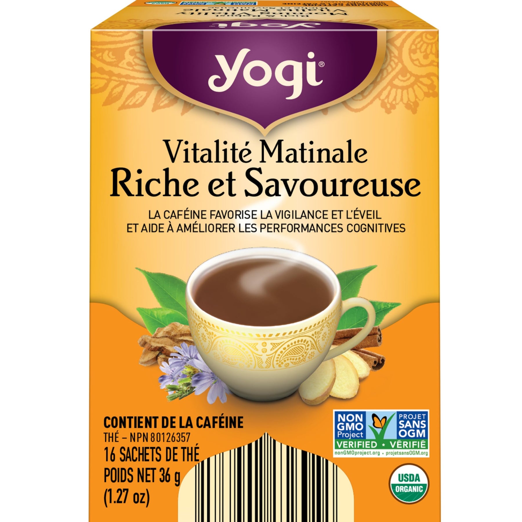 Yogi Rich & Robust Morning Vitality is a delightfully bold tea blend formulated to support alertness and wakefulness, and to aid cognitive performance. Roasted Chicory is combined with sweet Cinnamon, spicy Ginger, and Organic Black Tea for a deliciously roasted flavor. Enjoy a richly spiced cup of Yogi Rich & Robust Morning Vitality tea to start your day. <br><br>For over five decades, we’ve been making delicious, functional teas inspired by the ancient holistic healing philosophy of Ayurveda. Our diverse tea selection supports everyday well-being with specialized herbal formulas thoughtfully blended for both health benefits and appealing flavor. Yogi is a Certified B Corporation producing more than 40 tea blends from over 100 organic spices and botanicals sourced from around the globe. With every ingredient we source, and every tea bag we make, we strive to support environmental sustainability and social responsibility. We do so by following highly selective sourcing standards, performing rigorous quality tests, mandating environmentally sound farming practices, and partnering with local communities. Through such partnerships, we want to empower our entire tea ecosystem to live healthy, vibrant lives. It is our hope that our commitment to goodness shines through in every cup of Yogi tea.
