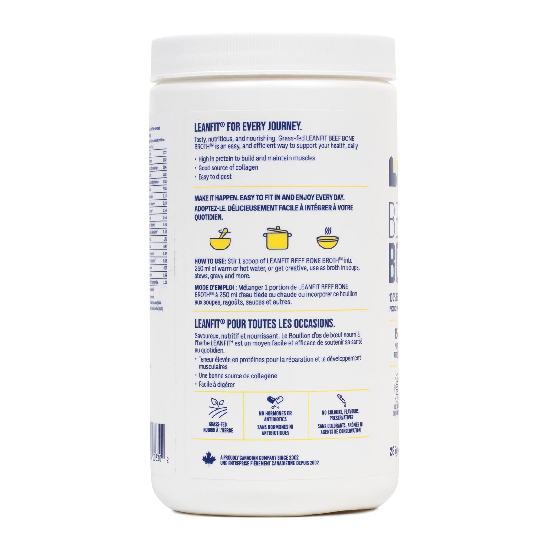Grass-fed LEANFIT 100% BEEF BONE BROTH is the tasty and convenient way to give your body the nutrition it needs. Made from 100% beef bones, your body will feel nourished and loved. Not only is the bone broth high in protein which helps to build and maintain muscles, but it also is a good source of collagen that helps with healthy joints and skin elasticity. Making beef broth has never been easier. Stir 1 scoop of LEANFIT BEEF BONE BROTH into 250ml of warm or hot water or get creative and use as broth in soups, stews, gravy, and more. Easy to fit in your day and enjoy. Fast digesting LEANFIT BEEF BONE BROTH is made with clean ingredients and is free from antibiotics, hormones, gluten, colours, flavours, and preservatives. At LEANFIT, we believe that every journey is unique, and everybody gets there differently. With small, steady wins, everyone can get the lift or personal momentum to keep going. Make it happen and make better choices easier with LEANFIT's amazing taste and nutrition.
