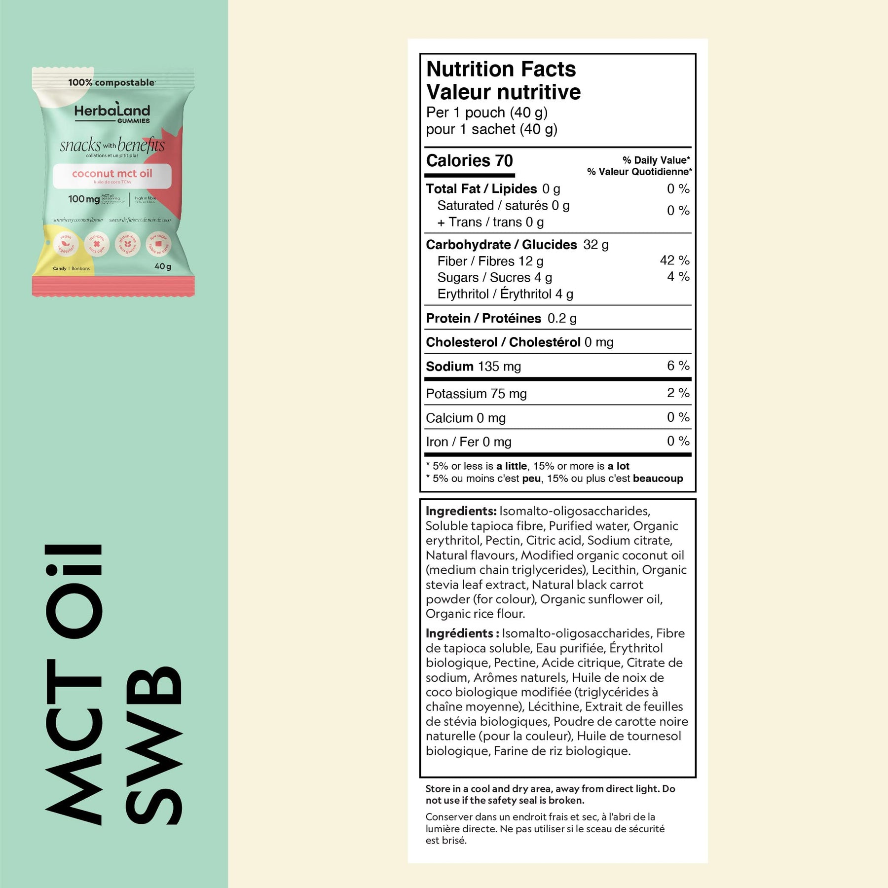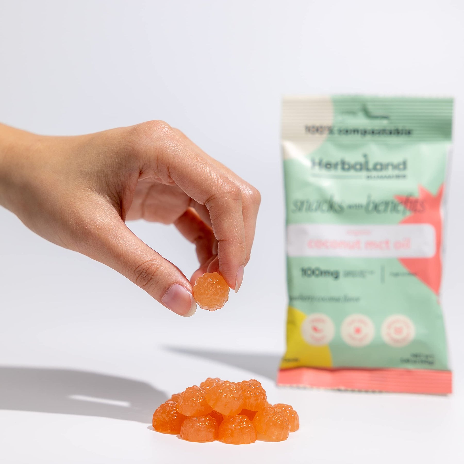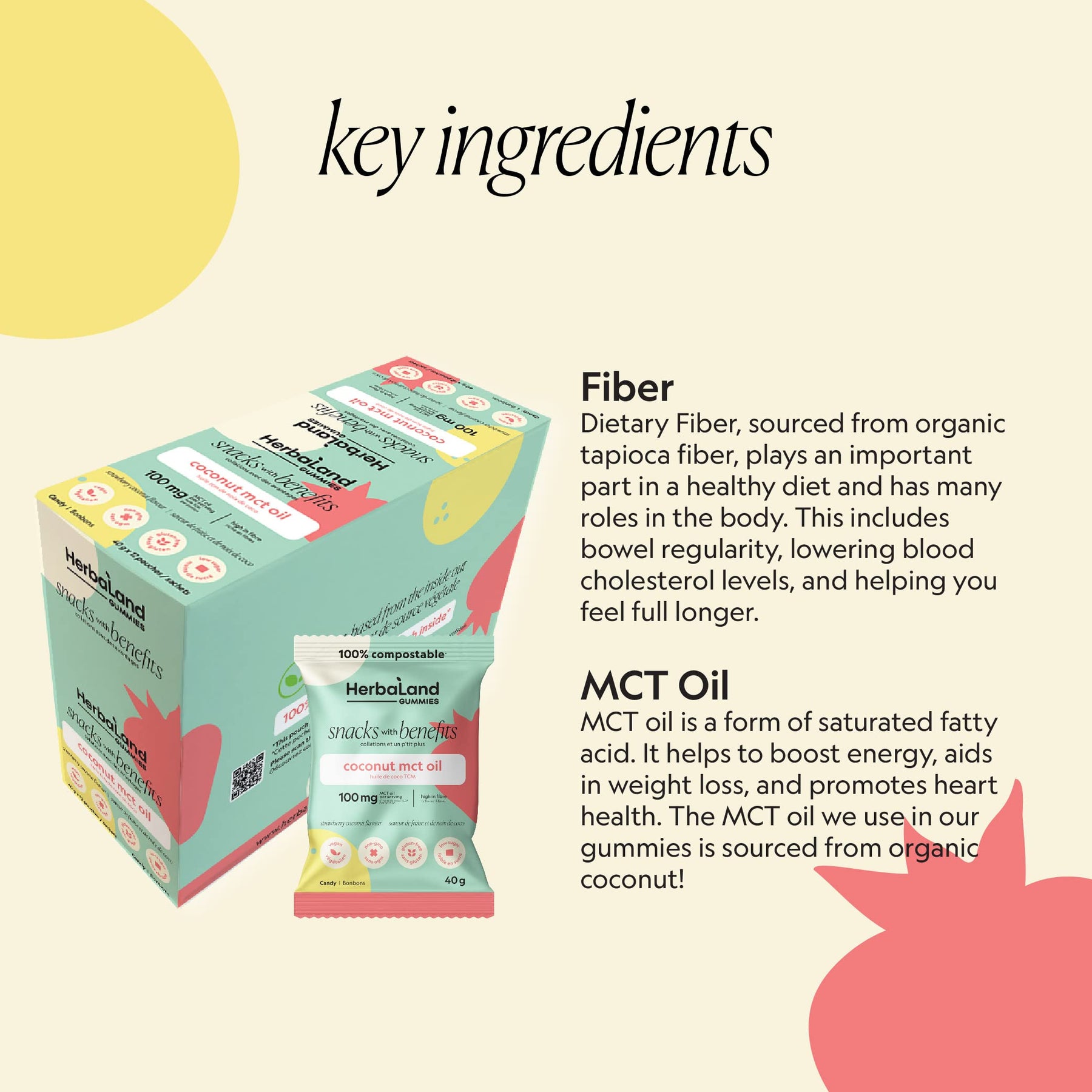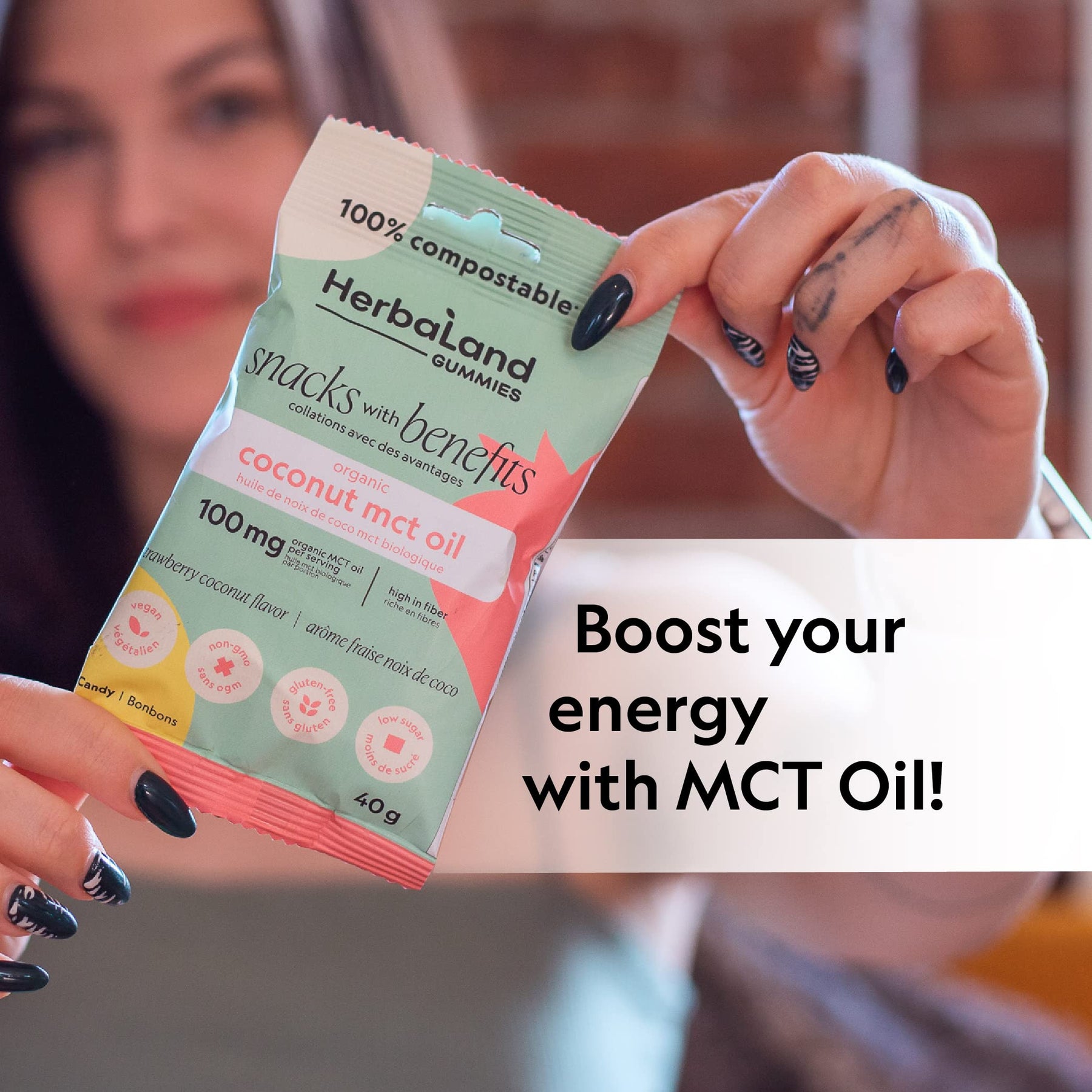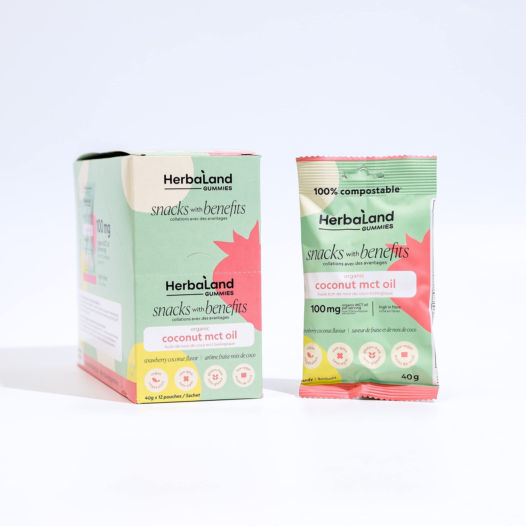 Herbaland Coconut MCT Oil Gummies – Snacks with Benefits – Vegan, Low-sugar, High-fiber, Gluten-free, 100mg of Organic Coconut MCT Oil & 12g of Organic Tapioca Fiber Per Pouch – Strawberry Coconut Flavor, 12 x 40g (Box of 12), Compostable Pouch