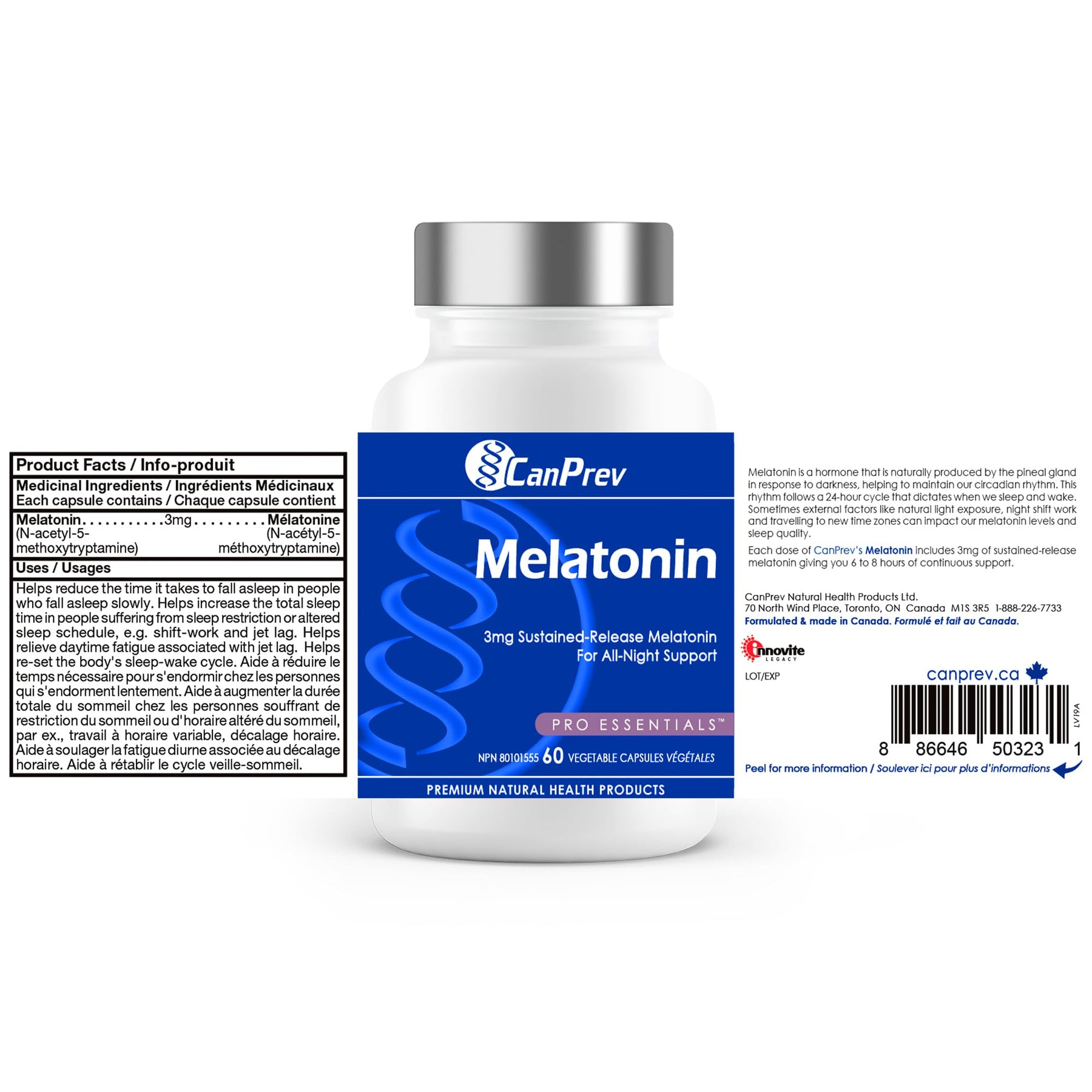 Medicinal Ingredients: Each capsule Ingredient: Melatonin (N-acetyl-5-methoxytryptamine) 3mg. Non-Medicinal Ingredients: Vegetable capsule, microcrystalline cellulose, vegetable-grade magnesium stearate, silicon dioxide.