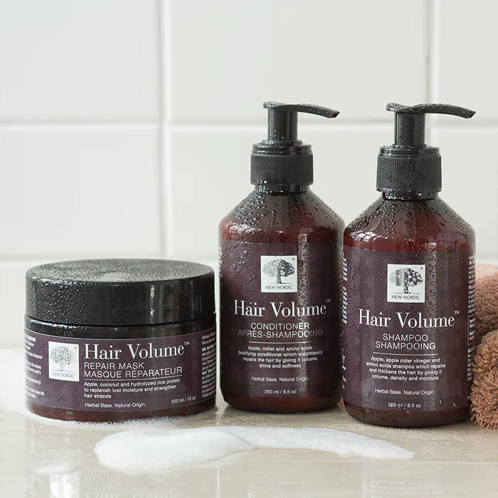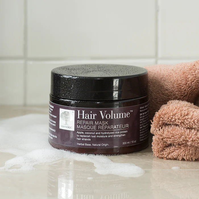 - After shampooing with Hair Volume™ Shampoo, apply a generous amount of Hair Volume™ Repair Mask to damp hair.