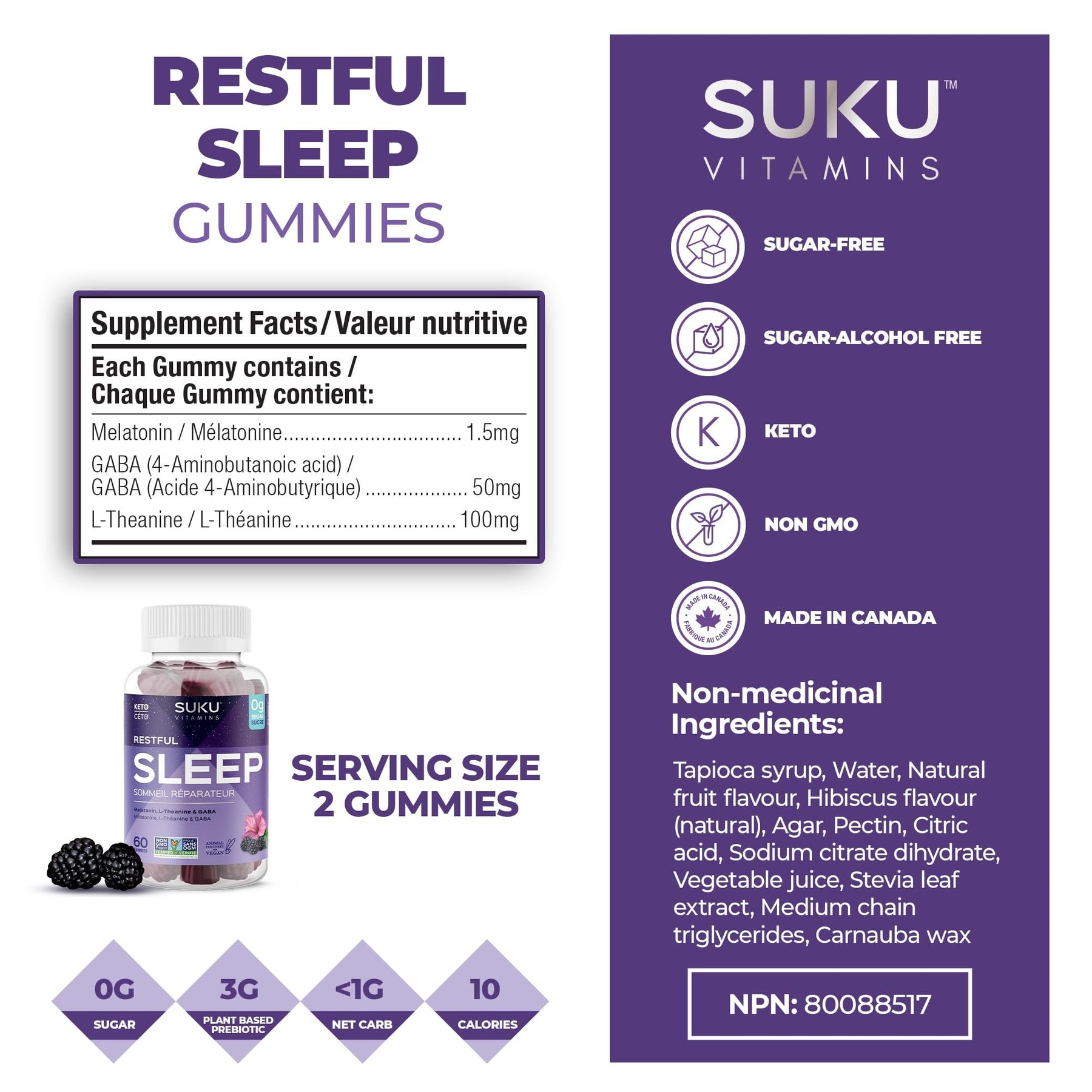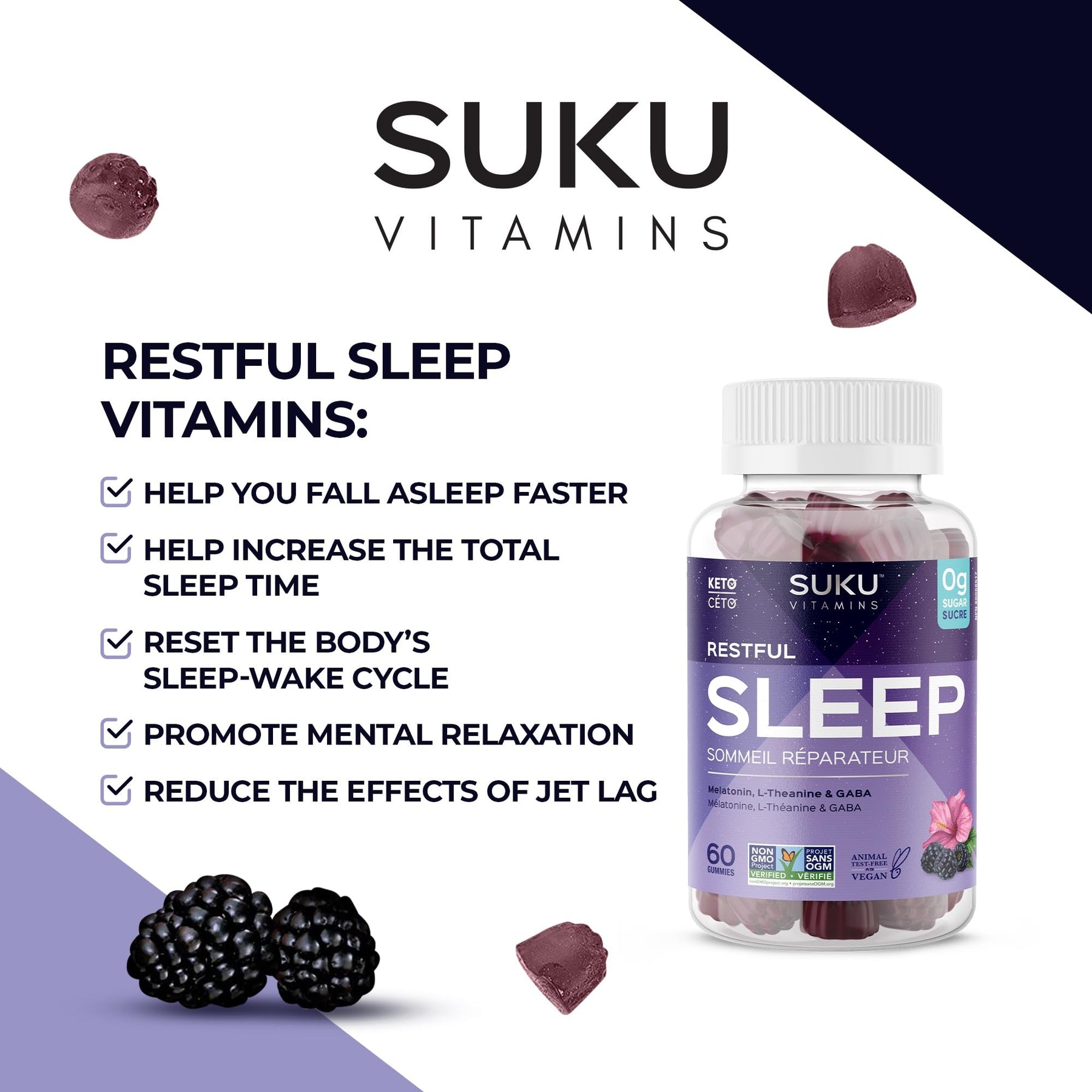 Unlock a better night's sleep with SUKU Vitamins Restful Sleep! Our plant-based gummies are designed to help you fall asleep faster and wake up feeling refreshed.