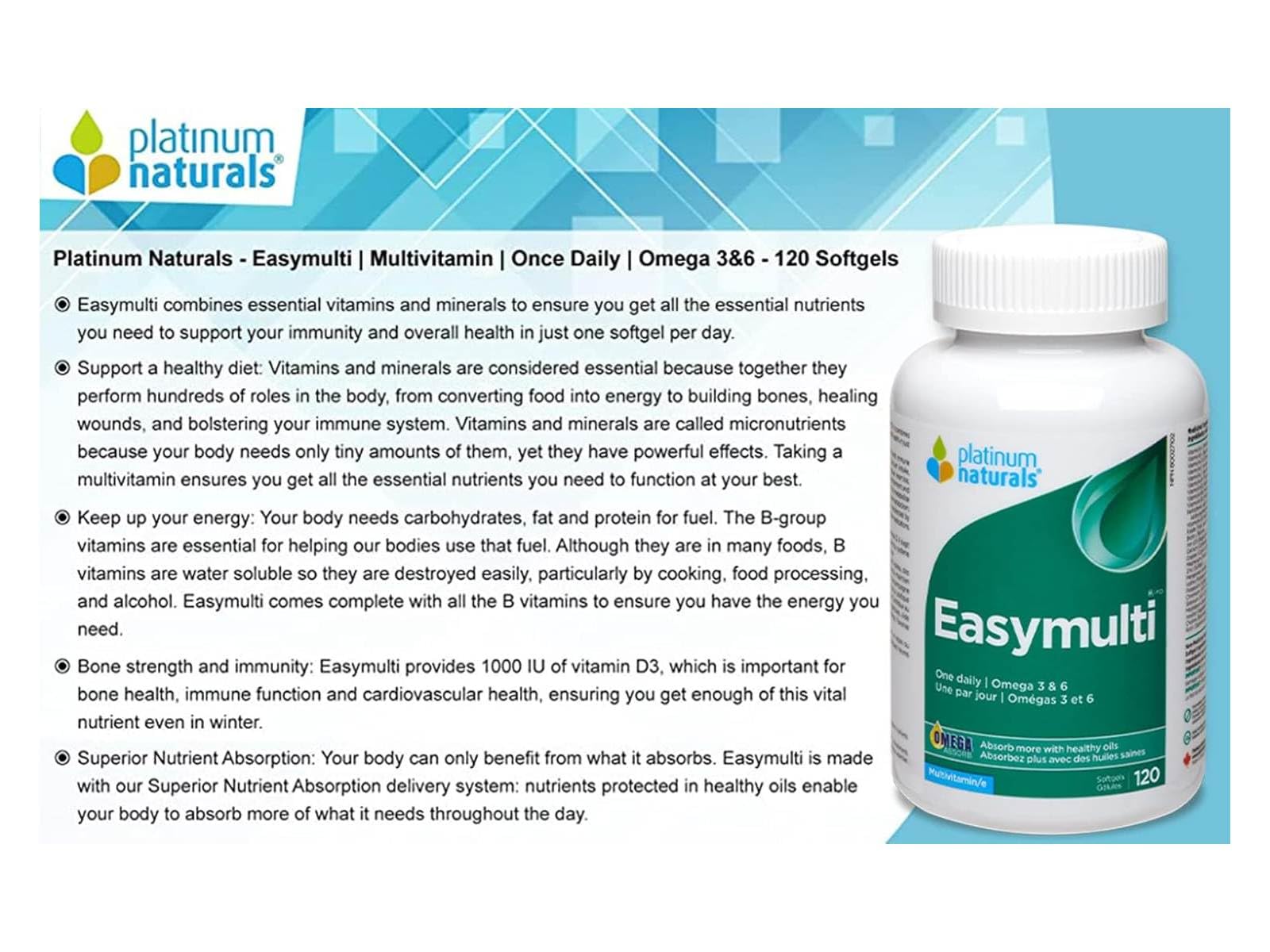 • Comprehensive Nutritional Support - Platinum Naturals Easymulti Omega 3 & 6 is expertly formulated to provide a balanced blend of vitamins and minerals, including Vitamin D3, Vitamin B6, and Vitamin B12, to support overall nutritional needs for both men and women.