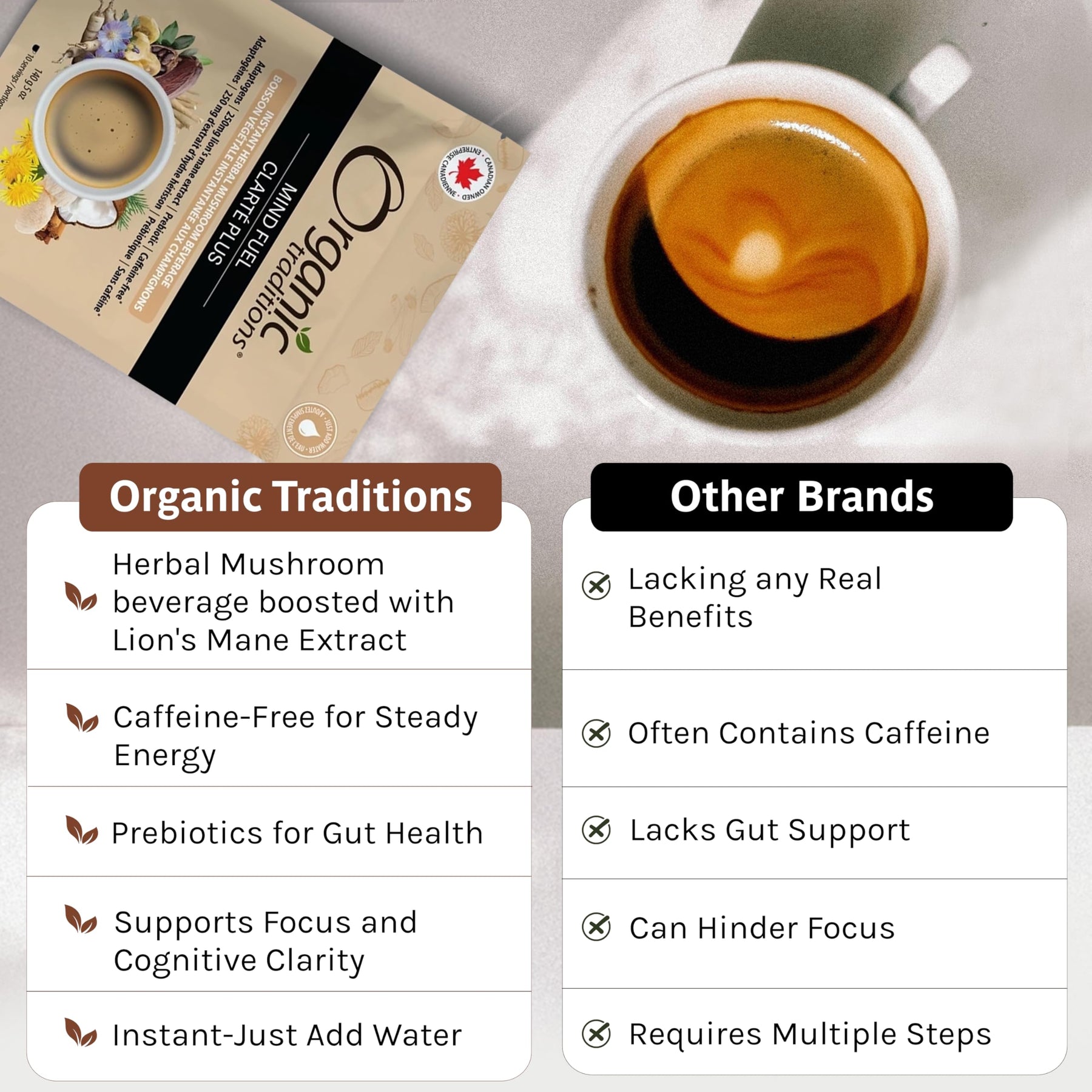 - Clean and Compatible: Made with high-quality organic ingredients, Mind Fuel is 100% vegan, and both keto- and paleo-friendly—offering a clean, herbal coffee substitute that fits seamlessly into any lifestyle or dietary preference.
