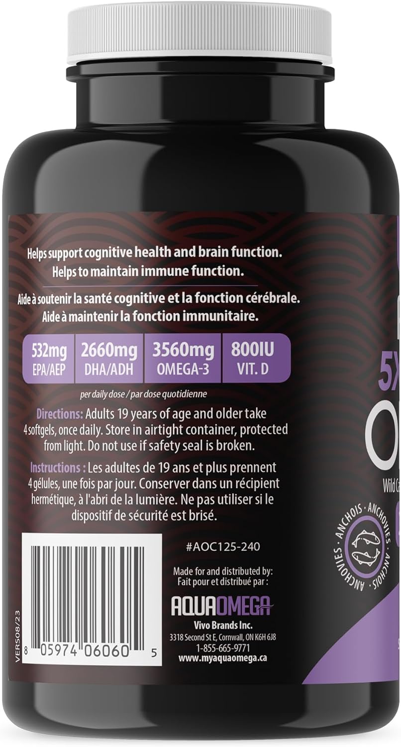 AQUAOMEGA 5X Ultimate Strength High DHA Supplement, Omega 3 Supplements with EPA & Vitamin D, Wild Caught Fish Oil Omega 3 Fatty Acids for Women & Men, Omega3 Fish Oil Supplement, 240 Softgels