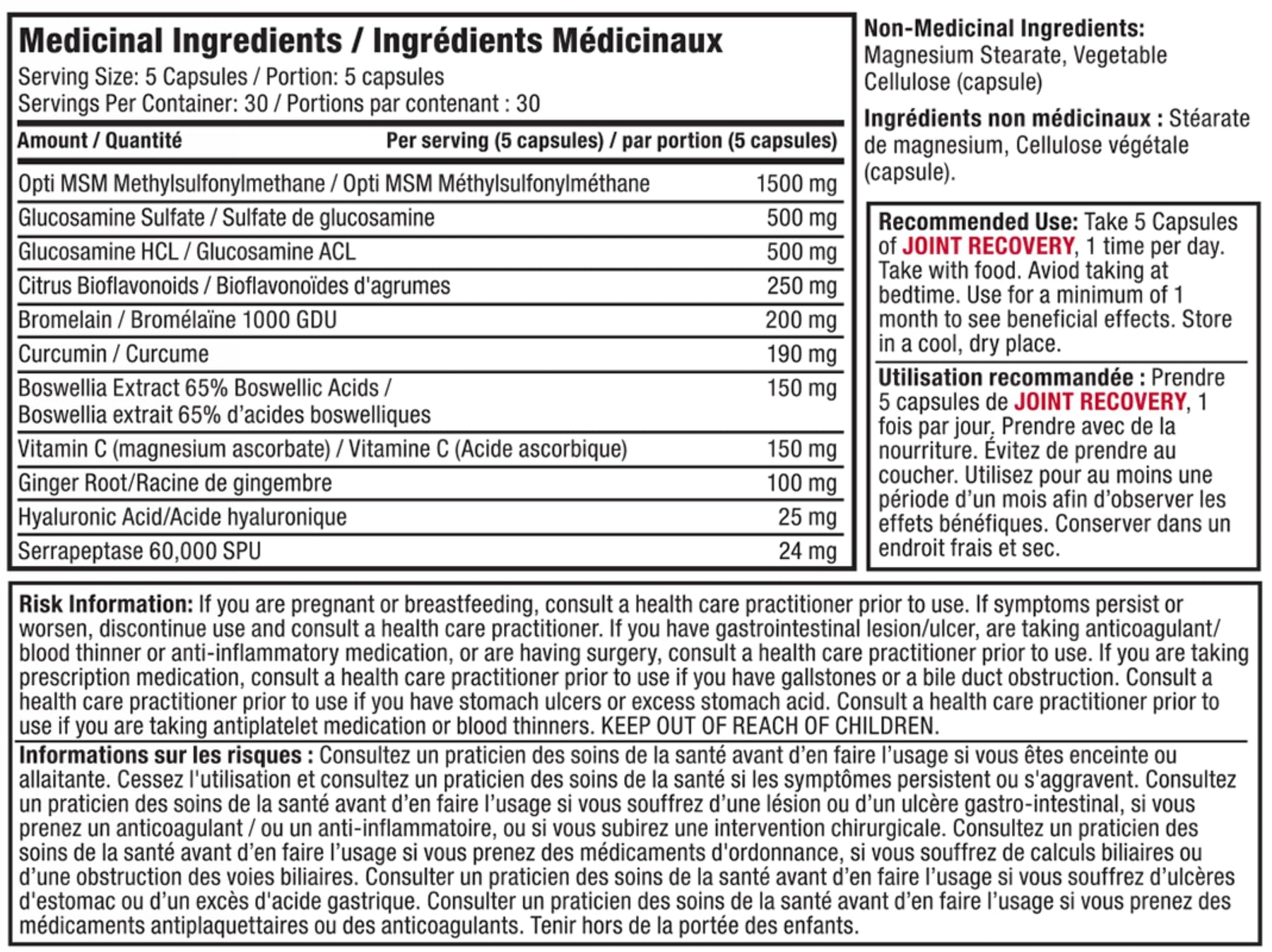 Take 5 capsules of Joint Recovery, 1 time per day. Take with food.