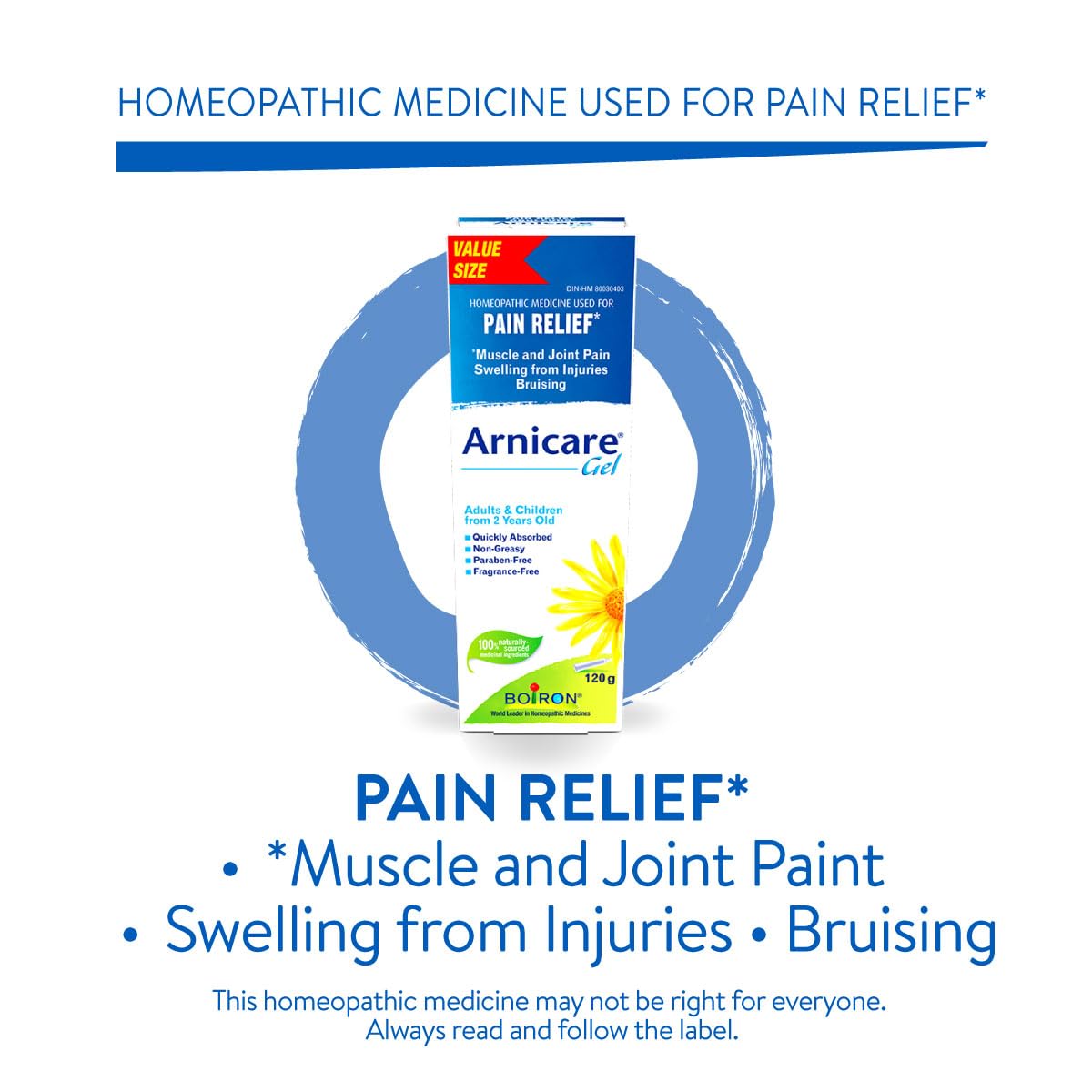 Boiron Arnicare Gel 120g for pain relief, Muscle pain and joint pain. Eases resorption of bruises and inflammatory oedema caused by falls, blows, blunt injury or surgery.