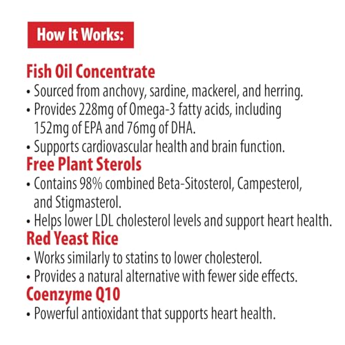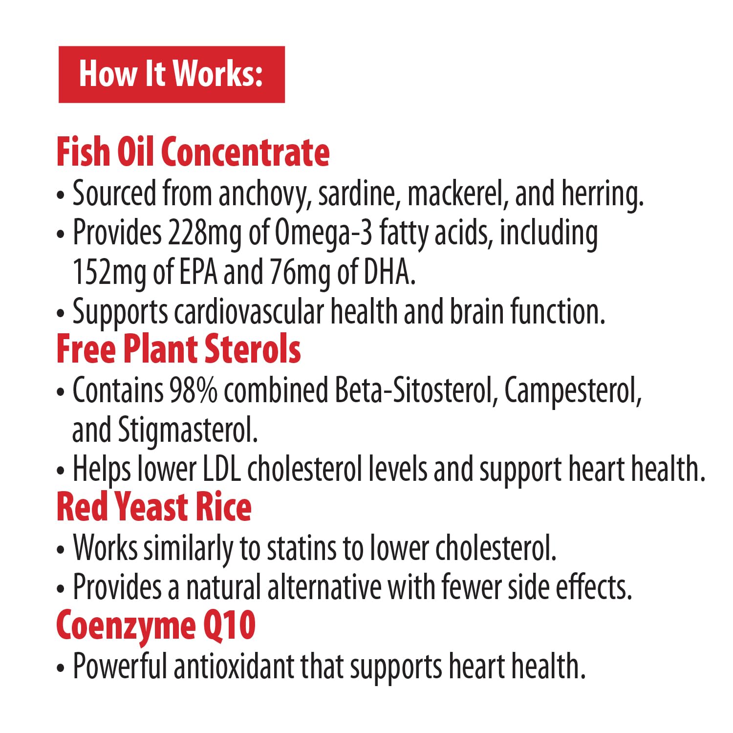 Heart Health: Contains Omega-3 fatty acids, plant sterols, red yeast rice, and Coenzyme Q10 to promote healthy cholesterol levels and heart function.