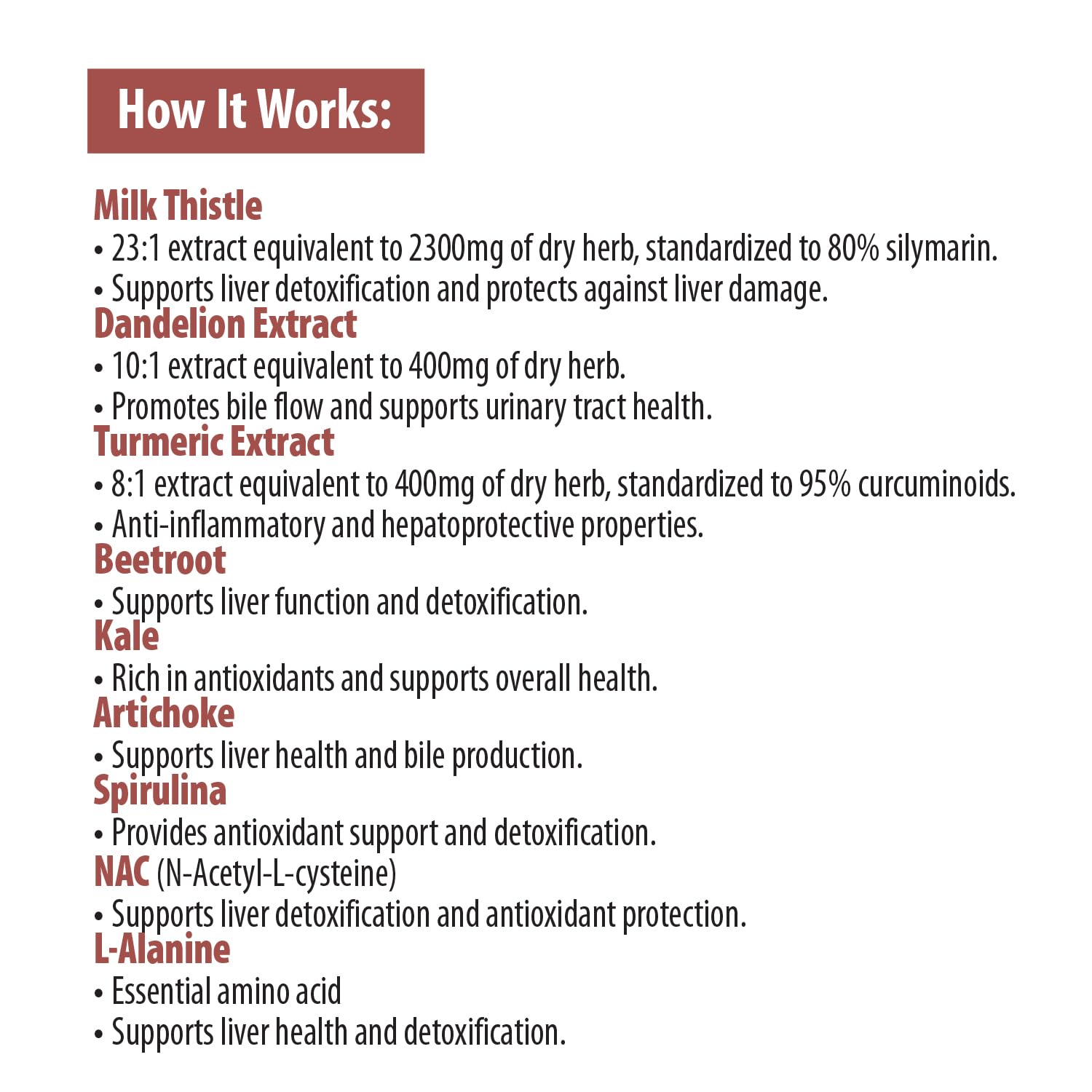 Key Ingredients: Milk Thistle (standardized to 80% silymarin), Dandelion Extract, Turmeric (with 95% curcuminoids), Beetroot, Kale, Artichoke, Spirulina, NAC, L-Alanine.