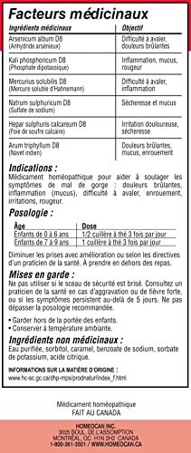 Homeocan Kids 0-9 Throat Ease contains homeopathic dilutions of: Aconitum napellus, Arnica montana, Belladonna, Bryonia alba, Hepar sulphuris calcareum, Mercurius solubilis, Phytolacca decandra, Spongia tosta.