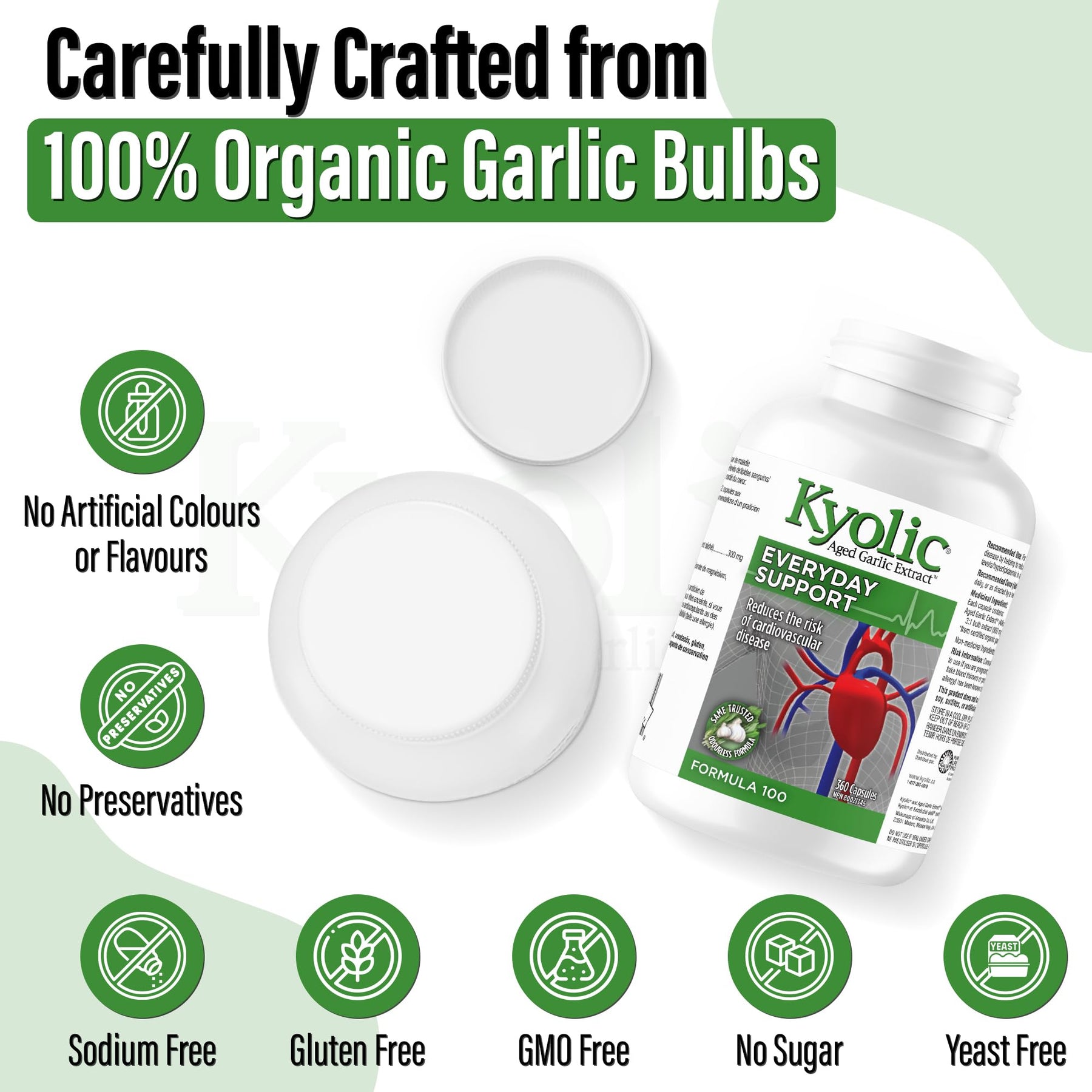 - Support cardiovascular wellness: Kyolic - Formula 100 everyday support combines the power of Kyolic aged garlic extract and organic garlic capsules to promote cardiovascular wellness. These garlic supplements are specially formulated for heart health.