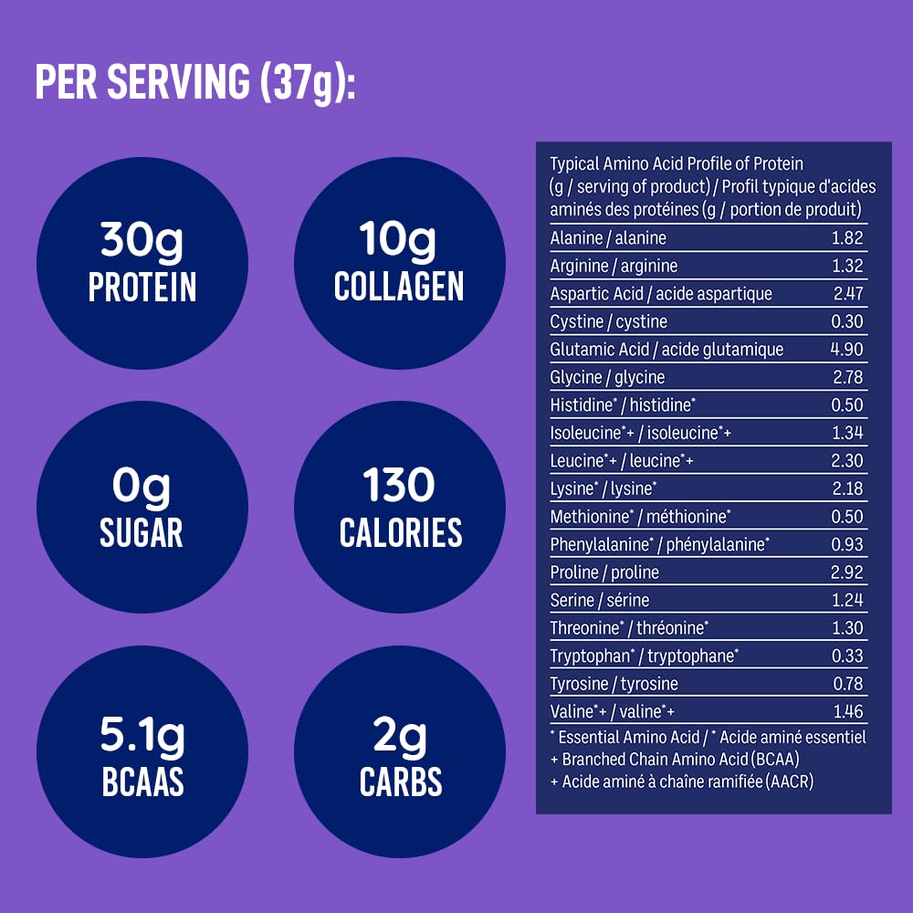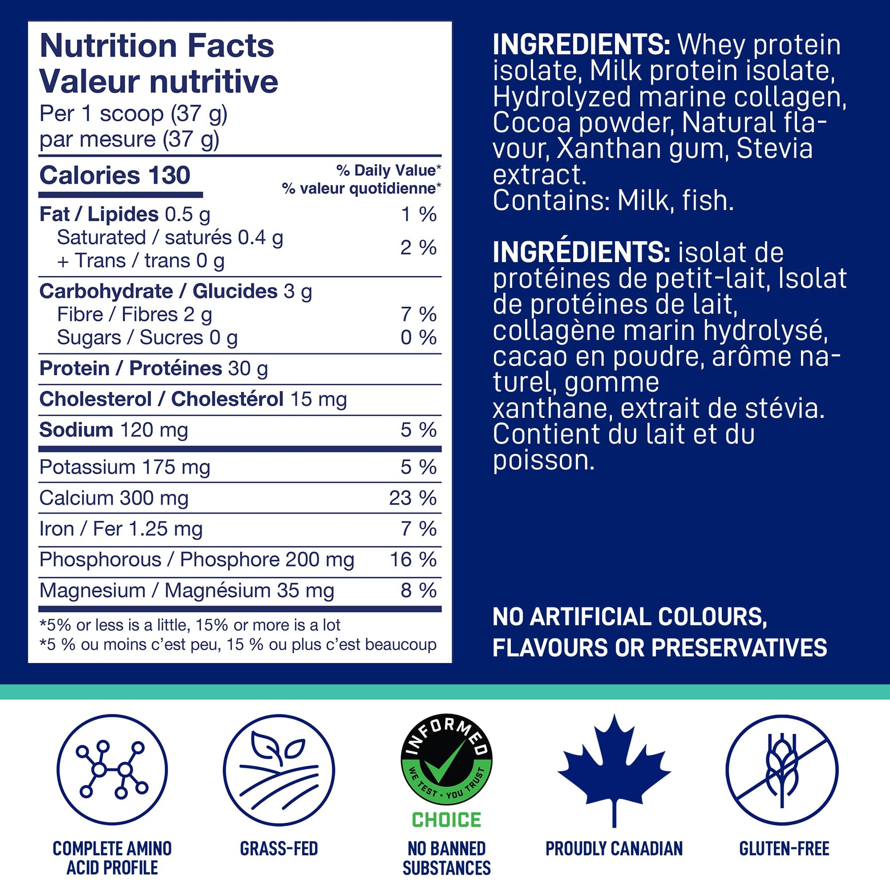 Whey Protein Isolate, Milk Protein Isolate, Hydrolyzed Marine Collagen, Natural Flavour, Xanthan Gum, Stevia Extract.