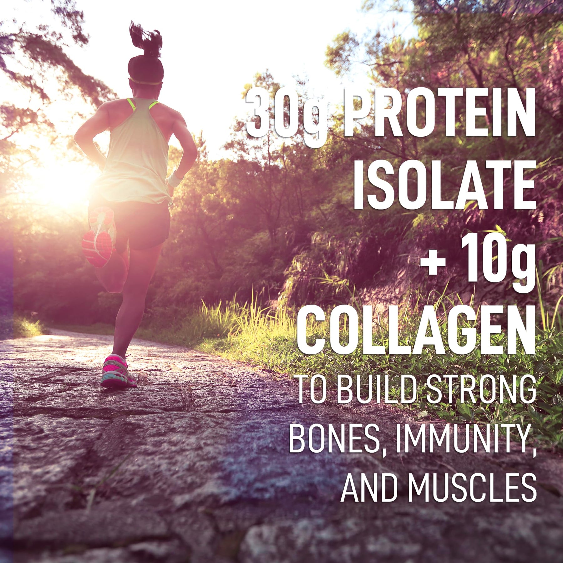 - ISOLATE PROTEIN & 100% HYDROLZYED MARINE COLLAGEN POWDER: Each serving contains 30g grass-fed protein isolate, 10g hydrolyzed marine collagen (type 1 and 3), 2g carbs, 130 calories, and 0g sugar.