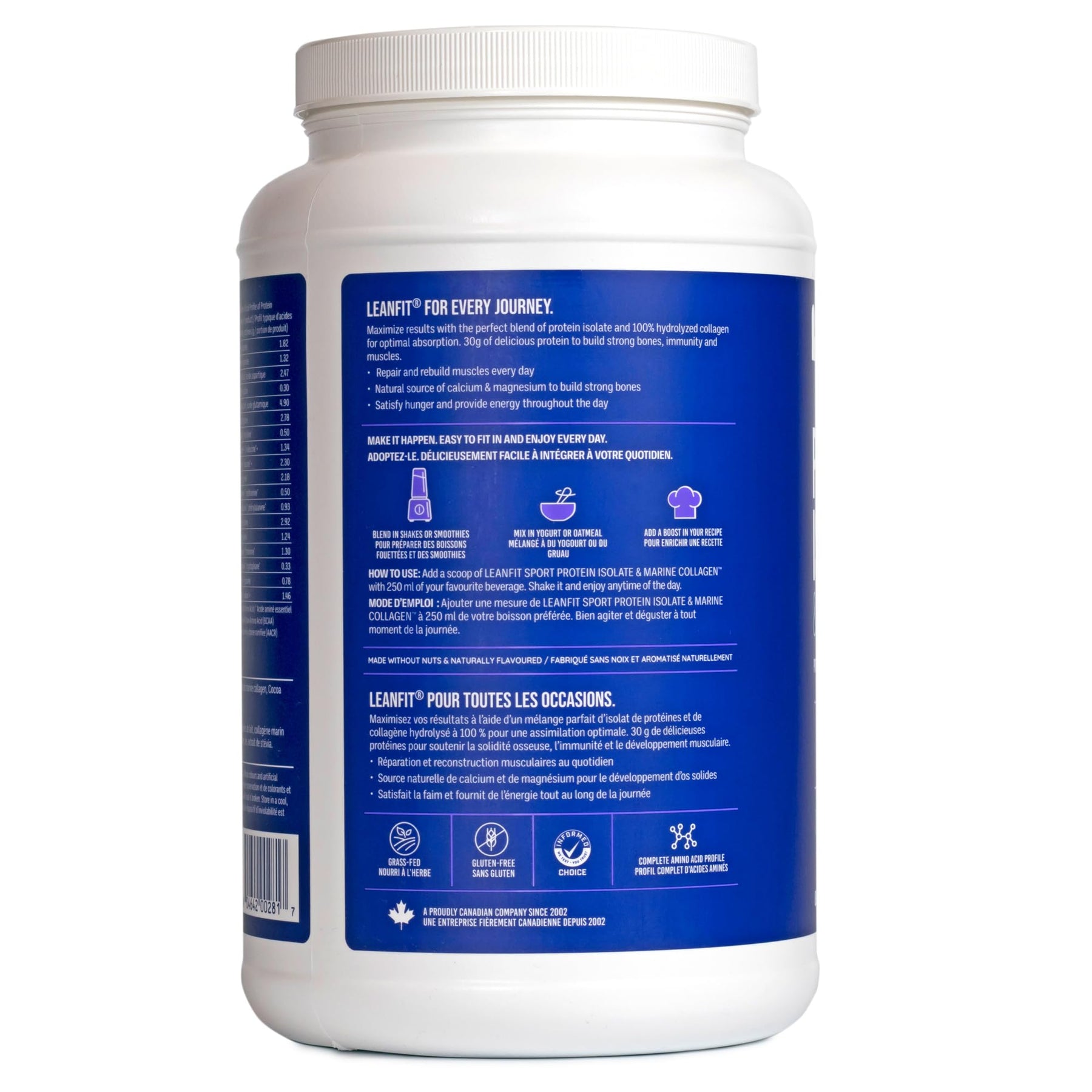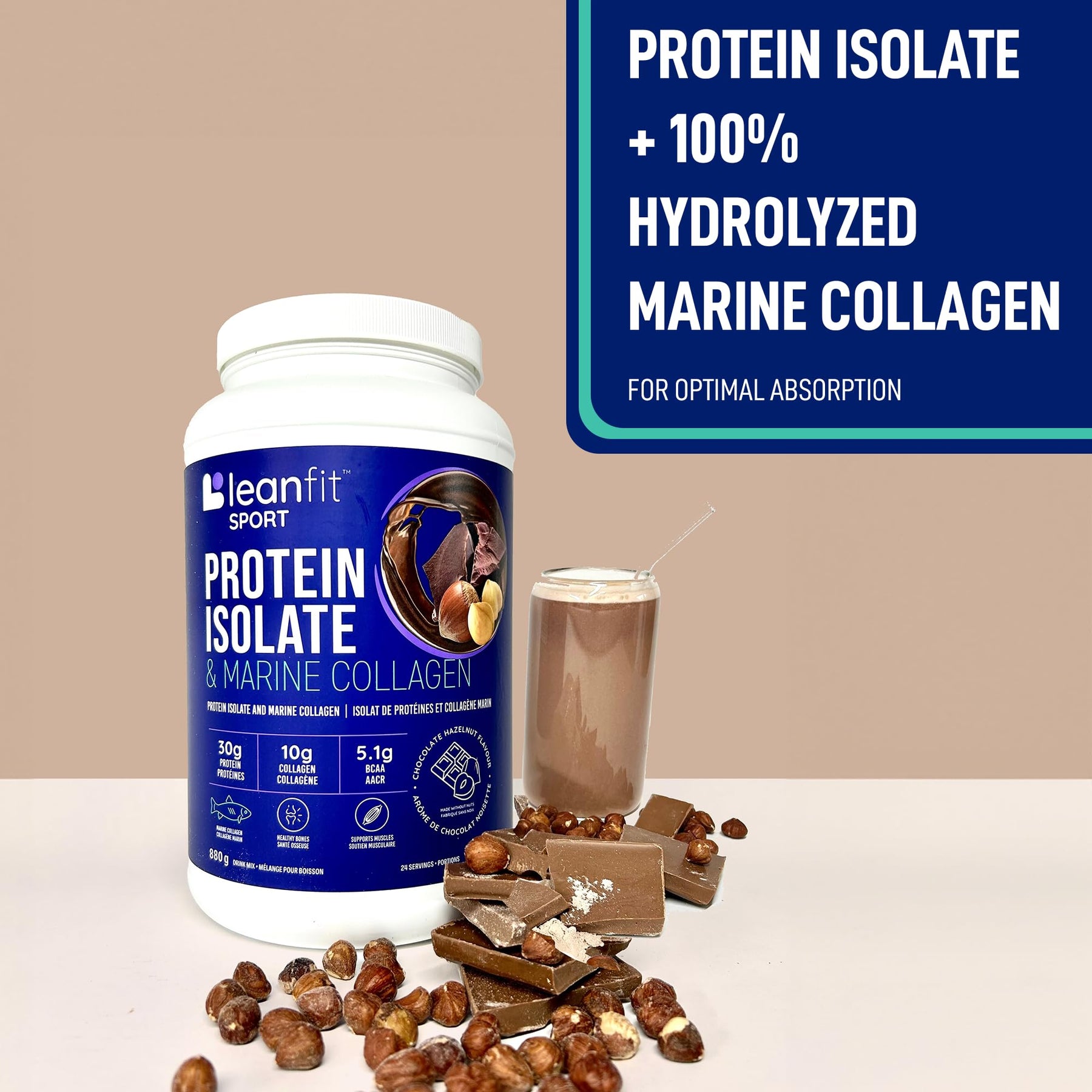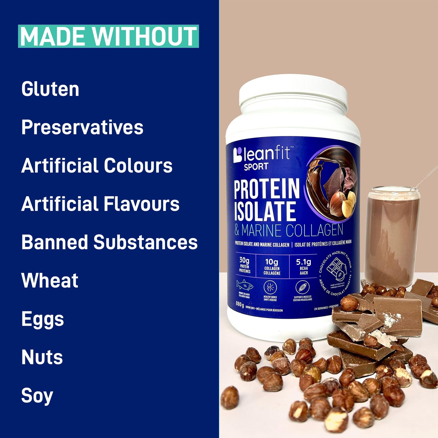 LEANFIT SPORT PROTEIN ISOLATE & MARINE COLLAGEN, Chocolate Hazelnut, Grass-Fed Protein Isolate and 100% Hydrolyzed Marine Collagen Powder (Type I, III), 30g Protein and 10g Collagen Per Serving, 24 Servings, 880g Tub