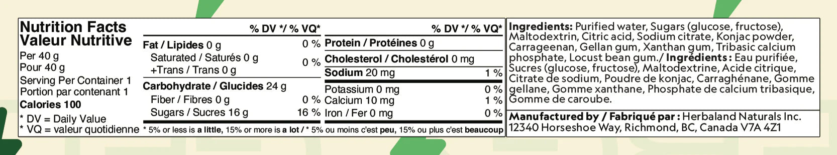 Purified Water, Glucose, Maltodextrin, Fructose, Citric Acid, Sodium Citrate, Carrageenan, Konjac Powder, Gellan Gum, Xanthan Gum, Tribasic Calcium Phosphate, Locust Bean Gum.