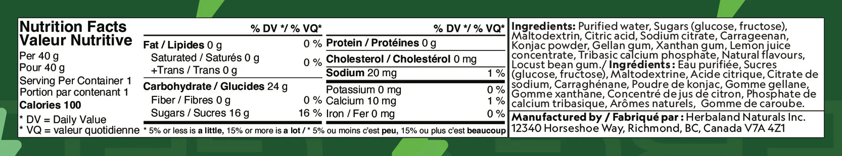 Purified Water, Glucose, Maltodextrin, Fructose, Citric Acid, Sodium Citrate, Carrageenan, Konjac Powder, Gellan Gum, Xanthan Gum, Lemon Juice Concentrate, Tribasic Calcium Phosphate, Locust Bean Gum, Lime Essential Flavour, Lemon Essential Flavour.