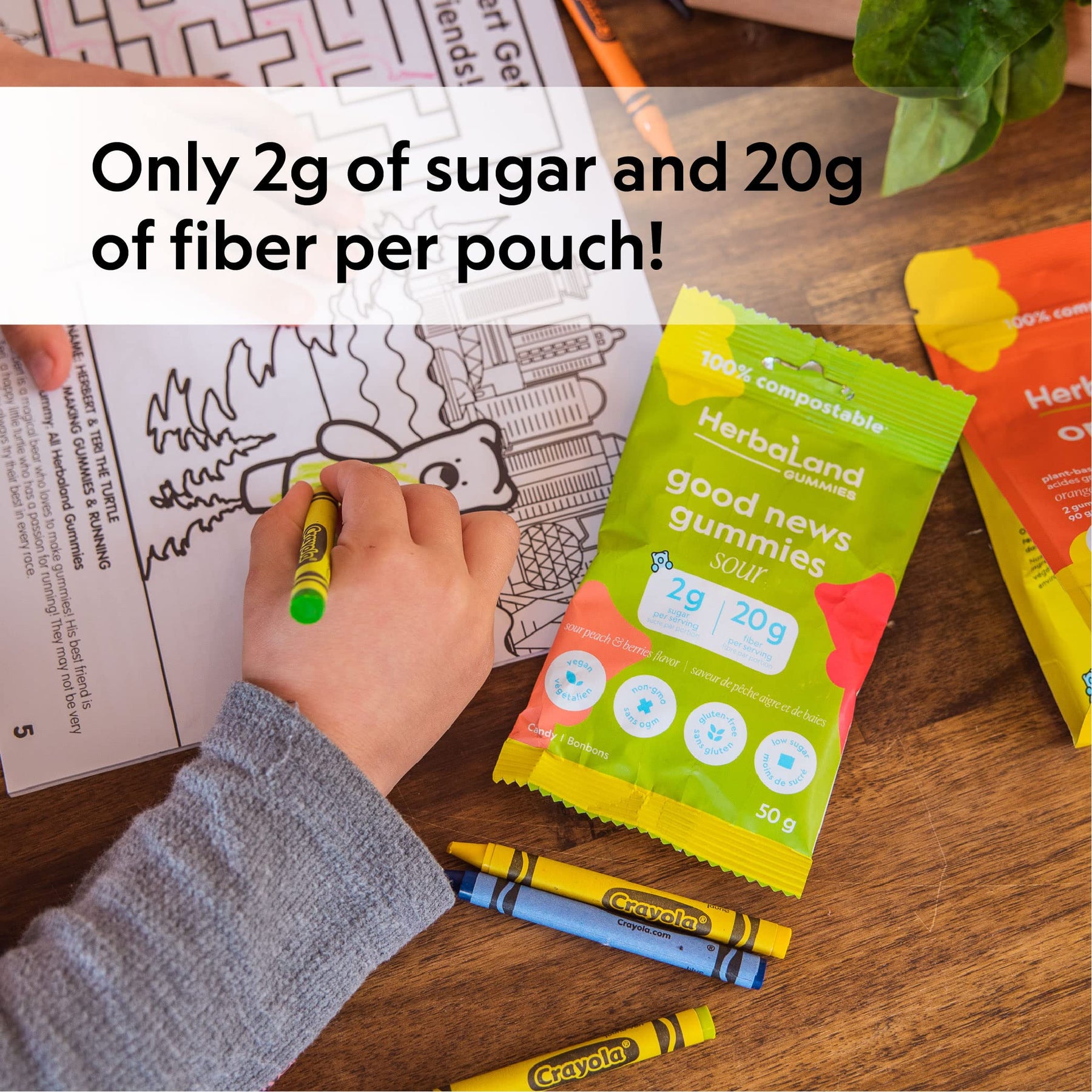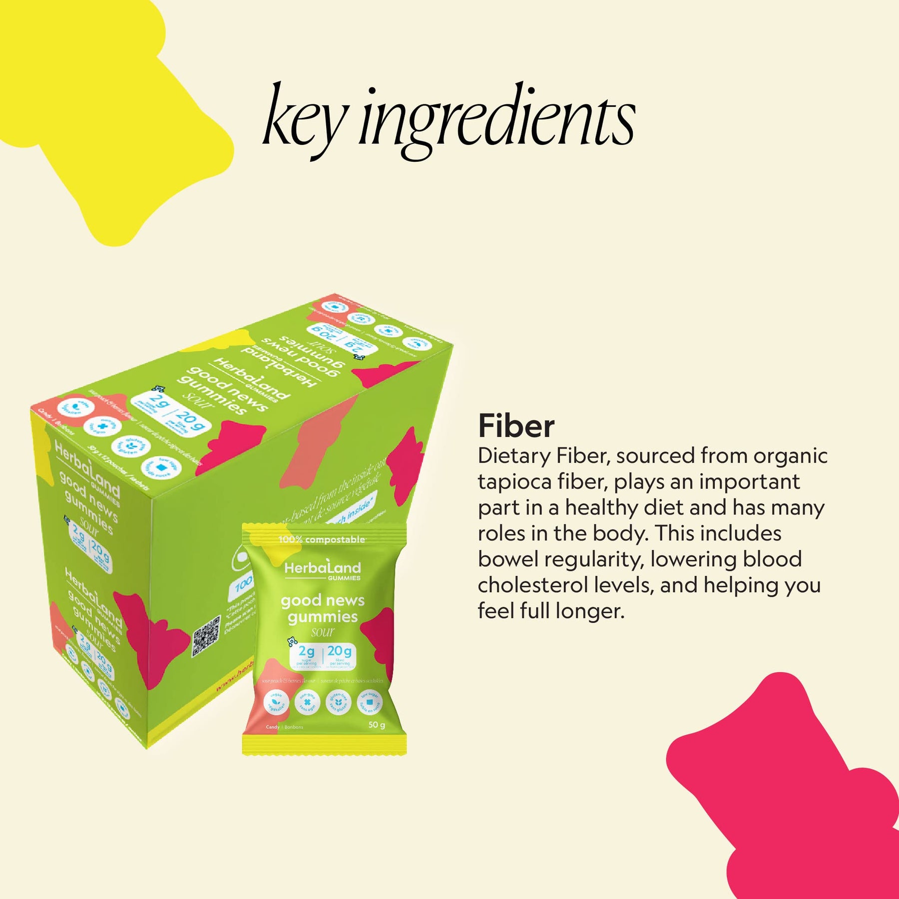 Herbaland Sour Good News Gummies Snacks – Vegan, Low-Sugar, High-Fiber, Gluten-Free, 20g of Soluble Tapioca Fiber Per Pouch, Sweetened with Organic Stevia Leaf Extract – Sour Peach & Berries Flavor, 12 x 50g (Box of 12), Compostable Pouch