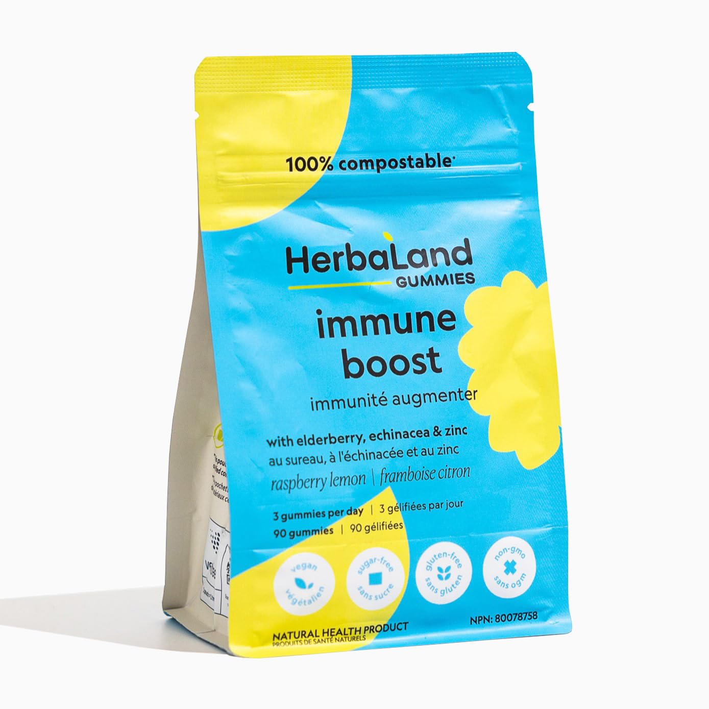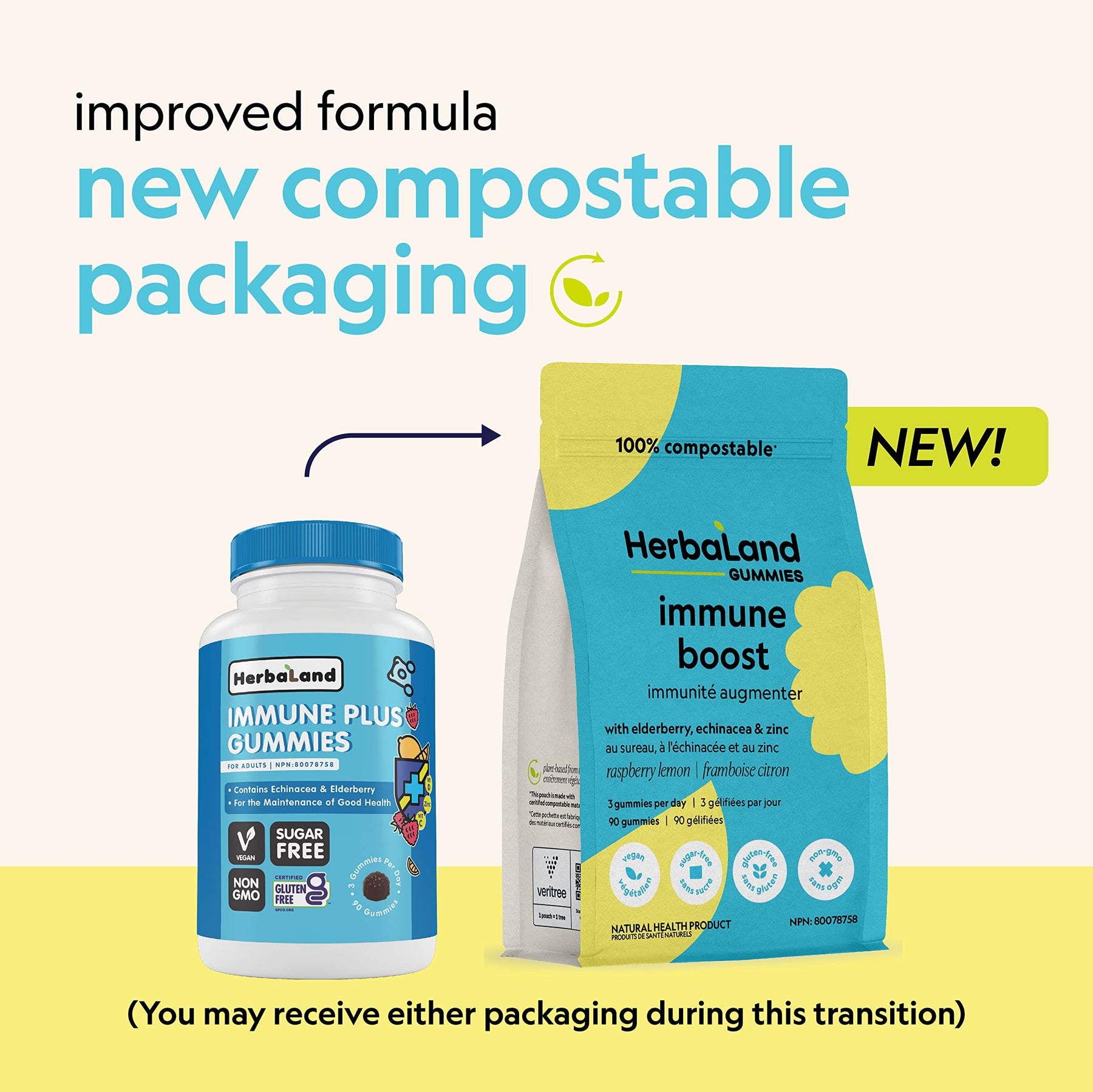 Herbaland Vegan Immune Boost (Immune Plus) Gummies for Adults - Contains Elderberry, Echinacea, Zinc, Vitamin D3, Vitamin C, Chewable, Sugar-Free and Gluten-free - Raspberry Lemon Flavor, 90 Count, Compostable Pouch